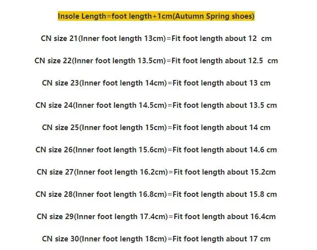 Длина стельки = длина стопы + 1 см (Демисезонная обувь) Размер CN 21 (Длина внутренней стопы 13 см) = длина стопы около 12 см Размеры CN; 22 (размеры соответствуют внутренней длине стопы 13,5 см) = соответствует европейскому размеру длины стопы около 12,5 см Размер CN 23 (Длина внутренней стопы 14 см) = длина стопы около 13 см Размеры CN; 24 (размеры соответствуют внутренней длине стопы 14,5 см) = соответствует европейскому размеру длины стопы около 13,5 см Размер CN 25 (Длина внутренней стопы 15 см) = длина стопы около 14 см Китайский Размер 26 (размеры соответствуют внутренней длине стопы 15,6 см) = соответствует европейскому размеру длины стопы около 14,6 см Размер CN 27 (Длина внутренней стопы 16,2 см) = длина стопы около 15,2 см Размер CN 28 (Длина внутренней стопы 16,8 см) = длина стопы около 15,8 см Размер CN 29 (Длина внутренней стопы 17,4 см) = длина стопы около 16,4 см Размер CN 30 (Длина внутренней стопы 18 см) = длина стопы около 17 см