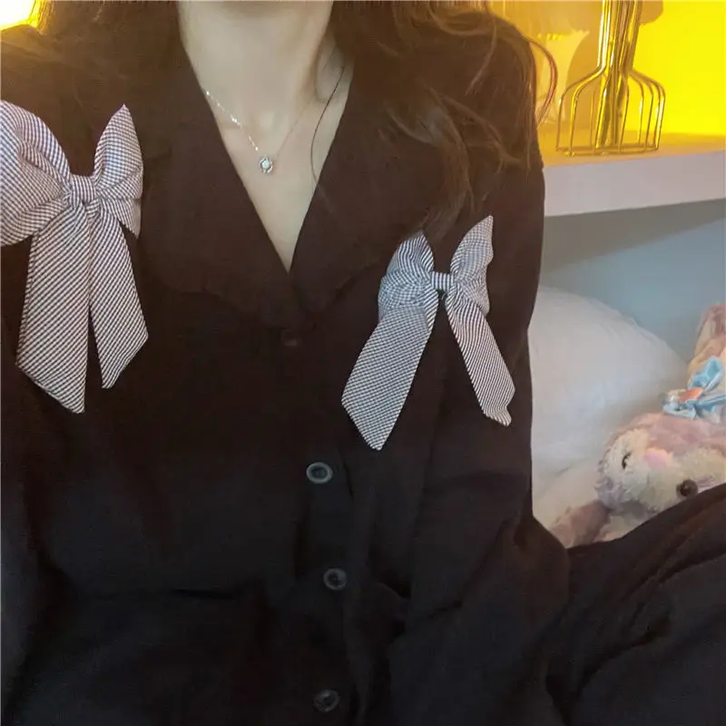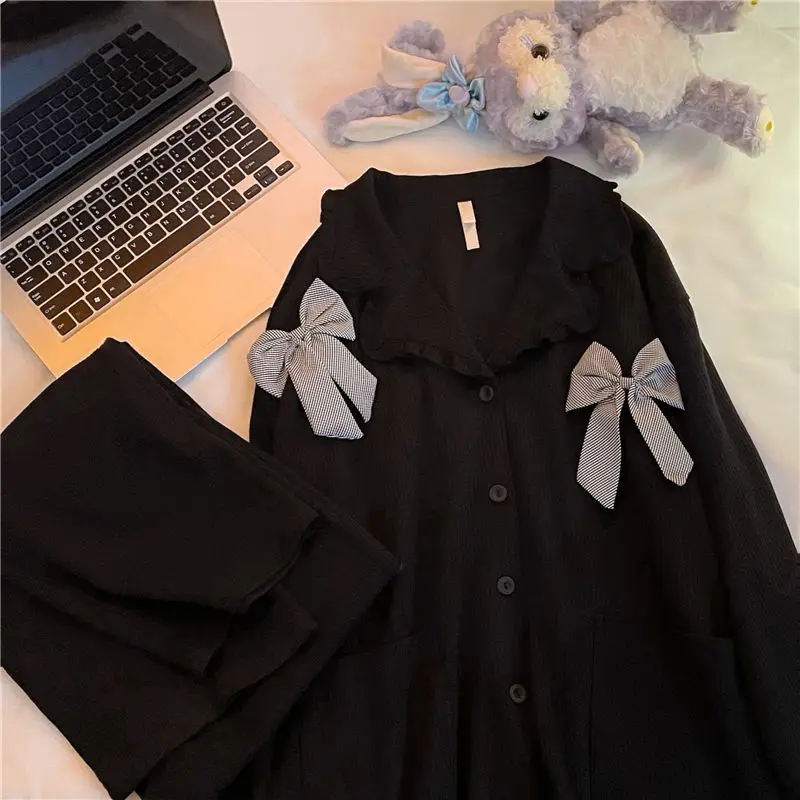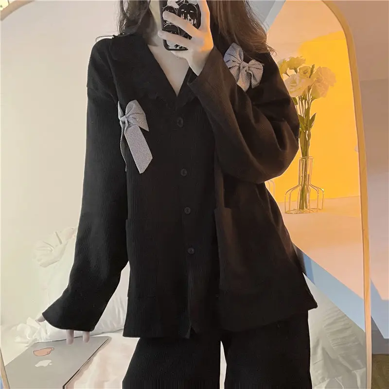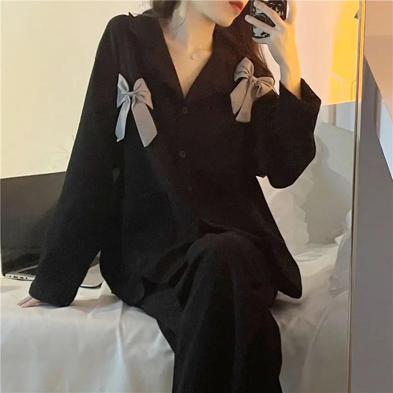 Женские пижамные комплекты Осенняя Милая Пижама с V-образным вырезом и длинным рукавом с бантом для студентов корейская мода удобная домашняя одежда свободная простая Пижама