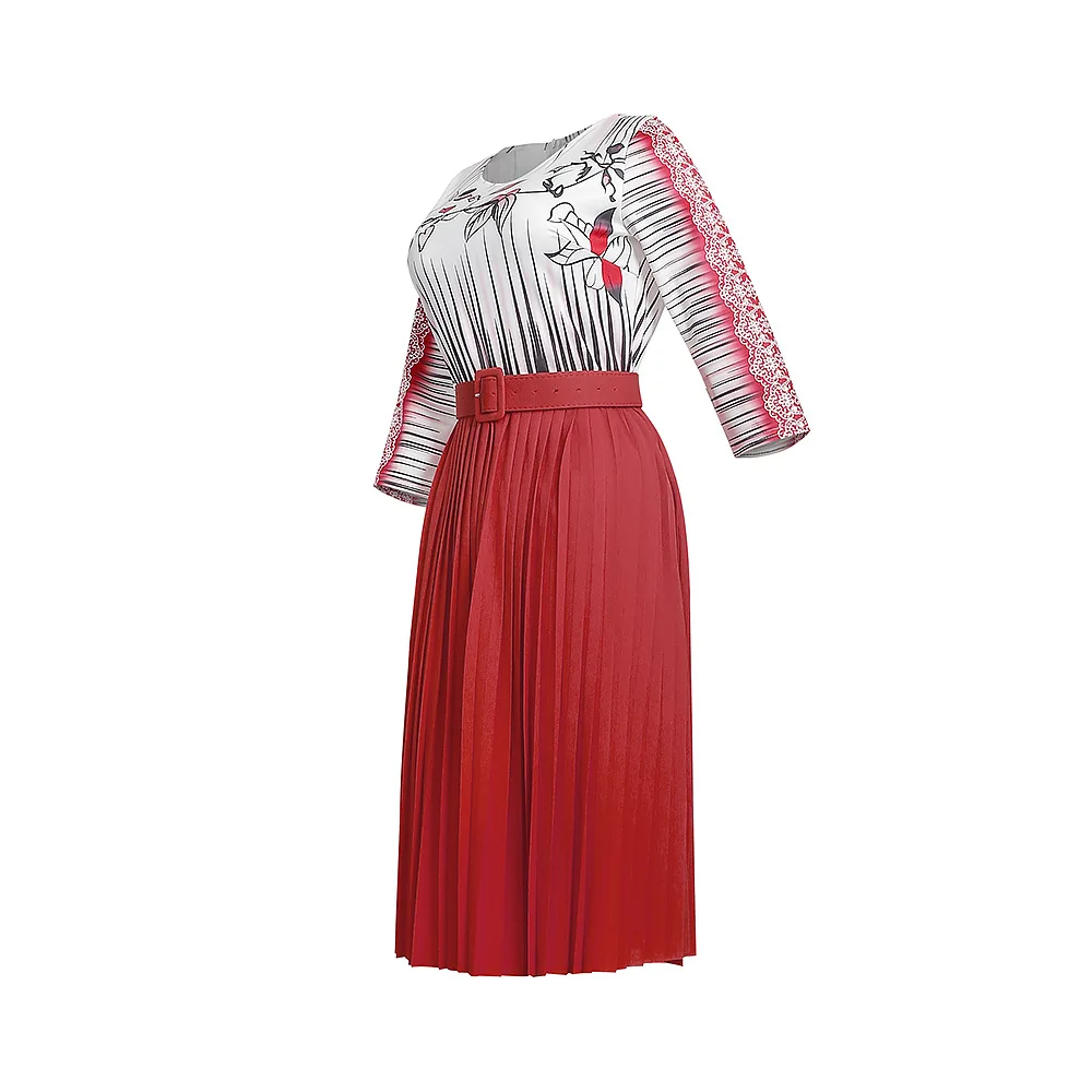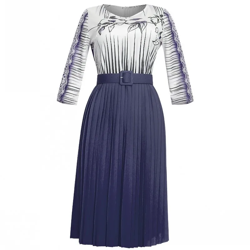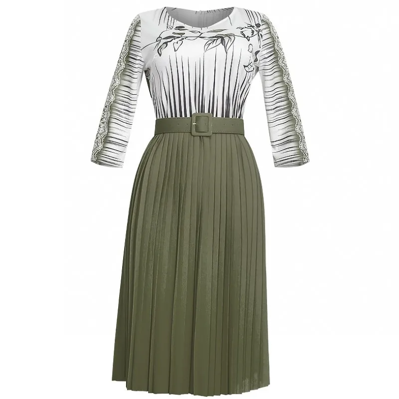 Женское плиссированное платье с поясом, повседневное офисное платье составного кроя с круглым вырезом, рукавом 34 и высокой талией