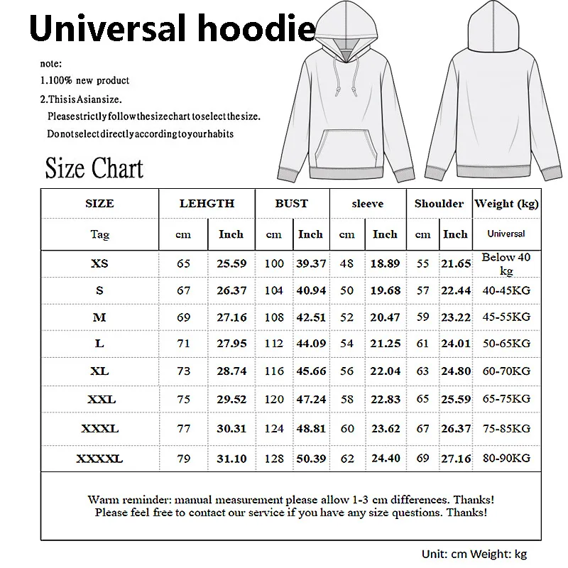 >Что можно напечатать< Текст ---- просто отправьте нам текст, который вам нужен для печати. И скажите нам, какой шрифт вам нравится. Фотографии-отправьте нам изображения с высоким разрешением, если у вас есть другие форматы, вы можете связаться с нами Мы печатаем ваш дизайн на толстовках >Вопрос: Как купить толстовки на заказ< Шаг 1: выберите размер и цвет толстовки Шаг 2: отправьте нам свой собственный дизайн. Шаг 3: мы напечатаем ваш дизайн на худи Наша одеждаАзиатский размерМеньше, чем США и Европейский союз. Если вы не знаете, как выбрать размер, пожалуйста, сообщите мне ваш рост и вес. Вы получите ответ в течение 24 часов. Мы выберем правильный размер для вас.