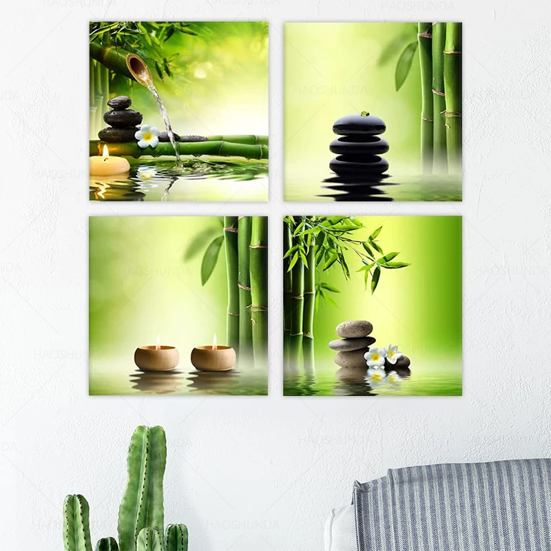 Современные 4 панели современные дзен Холст принты бамбук зеленые картины на холсте настенное искусство для дома офиса ванной комнаты Настенные Украшения