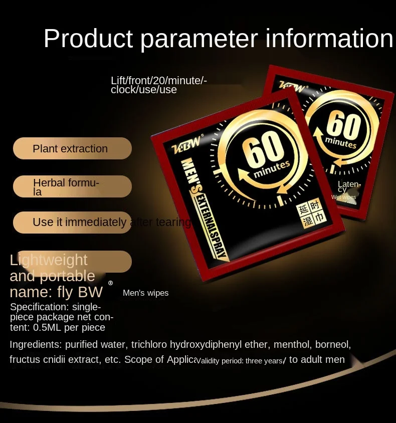 Использование:30 минут до секса используйте продукты для очистки пениса и коронарного канава, пожалуйста, не протирайте отверстие уретры, используйте 1 шт. в течение 1 времени