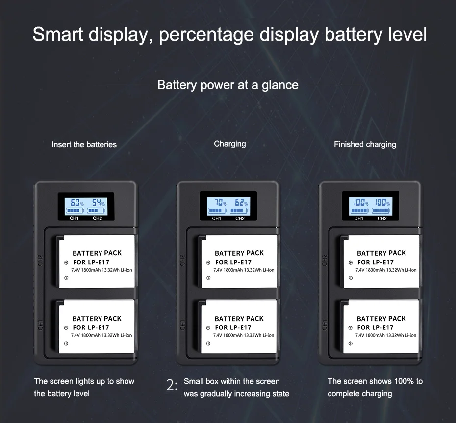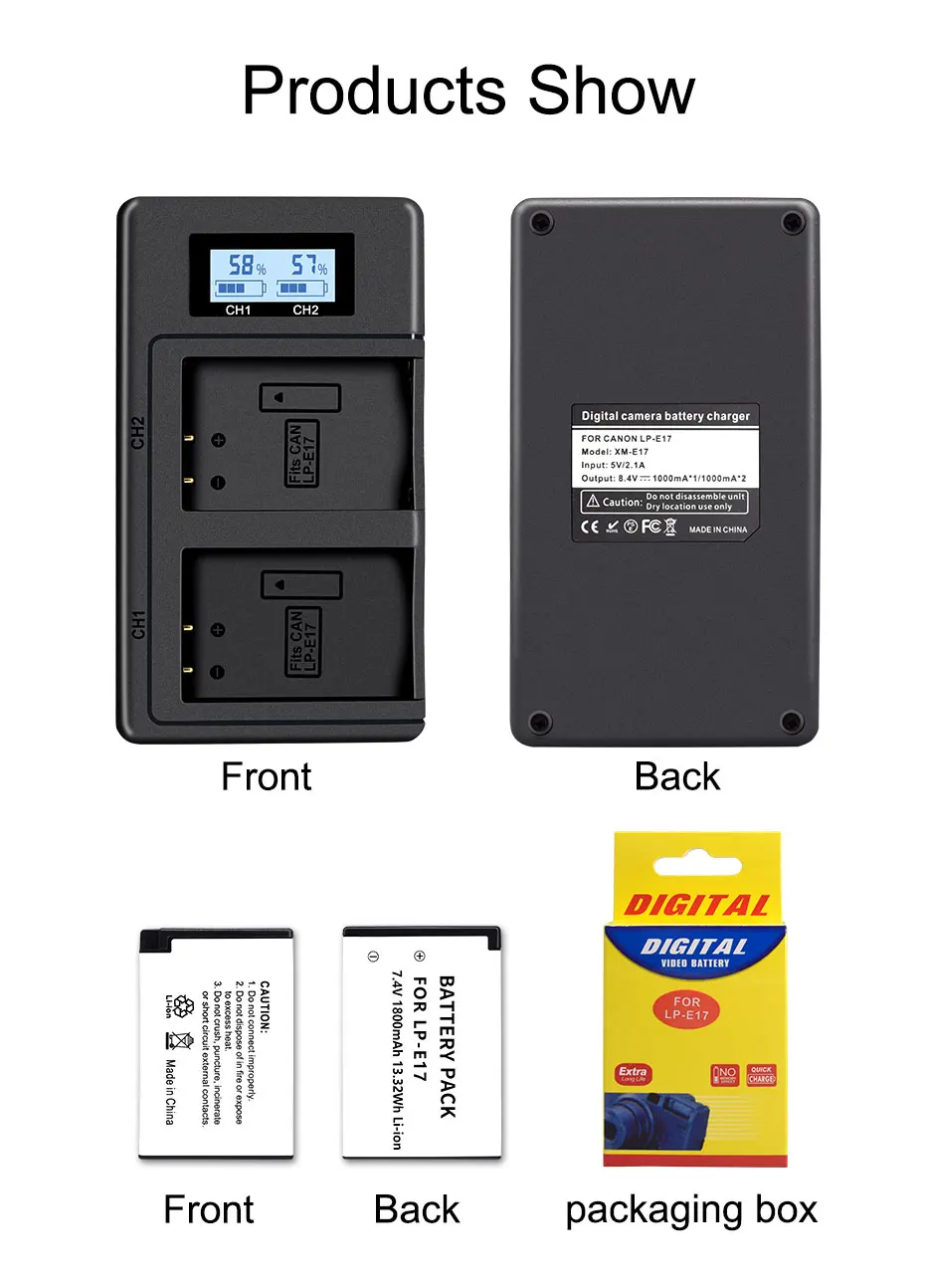 Аккумулятор PALO LP-E17 в процессе обновления. Он покажет уровень мощности на Canon Rebel T6i, T6s, T7i, EOS SL2 ,750D, 760D, 77D , 800D, 8000D, камера EOS 200D KISS X8i Digita SLR (не включает в себя камеру Canon M Series s ) . Не отображает Срок службы батареи в камерах Canon Eos M3, M5, M6. Аккумуляторы должны заряжаться от зарядного устройстваСовместимые модели:EOS 200D 200D IIEOS M3 M5 M6EOS 750D 760D 800D / 850DEOS T6i T6s (EOS 760D/EOS 8000D)EOS 800D 8000D 77D 9000DEOS Kiss X8iEOS Rebel RP SL2 / SL3 (EOS 250D/EOS Kiss X10)Цифровая зеркальная камера EOS Rebel T8i T7iПосылка включает в себя: (зависит от того, какой набор вы выбираете)2x LP-E17 батареи1X двойное зарядное устройство с ЖК-дисплеемОсобенности:1. Литий-ионные аккумуляторы премиум класса2. Высокая плотность энергии, долгий срок службы, без памяти3. Дополнительная мощность, больше снимков для ваших камерПримечание:На экране камеры нет уровня заряда батареи. LP-E17 не может заряжаться оригинальным зарядным устройством Canon, только может заряжаться зарядное устройство PALO LP-E17, но оригинальный аккумулятор Canon LP-E17 может заряжаться зарядным устройством PALO.
