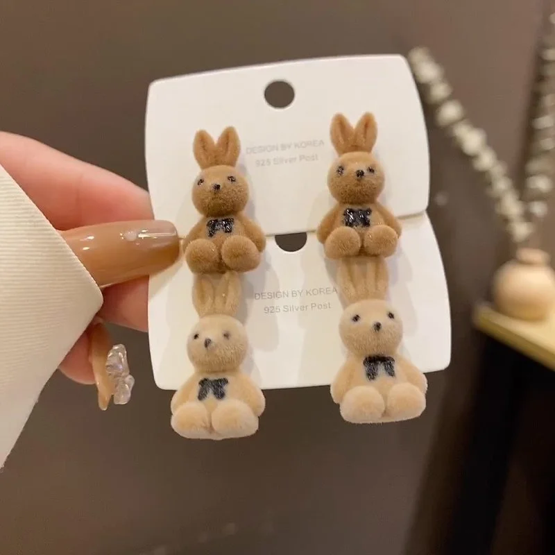 Флокированные плюшевые серьги-гвоздики в виде кроликов и медведей, ...