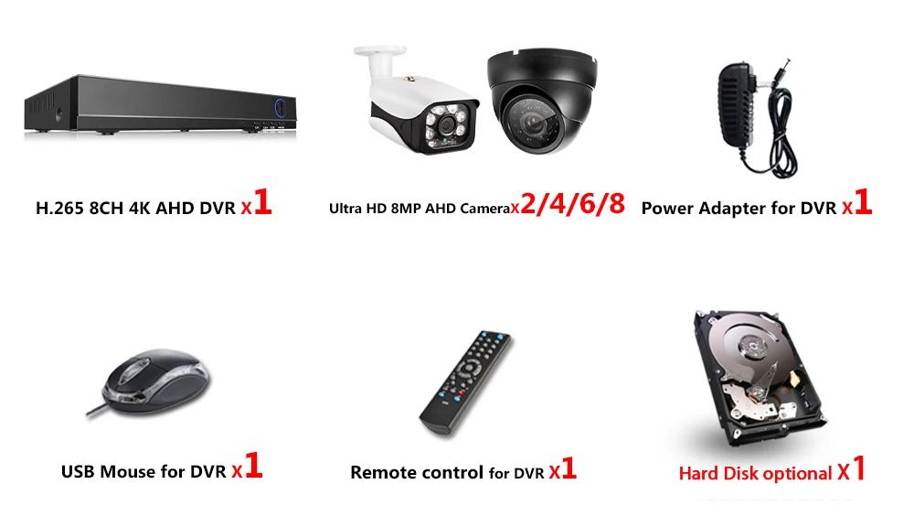 1 х 8-канальный H.265 AHD 4K DVR 6 в 1 цифровой видеорегистратор;2/4/6/8 x HD 8.0MP для дома и улицы ИК Ночного Видения Всепогодные камеры;1 х адаптер питания для DVR;1 X USB мышь для DVR;1 пульт дистанционного управления для DVR;1 X CD программное обеспечение для DVRЖесткий диск опционально!
