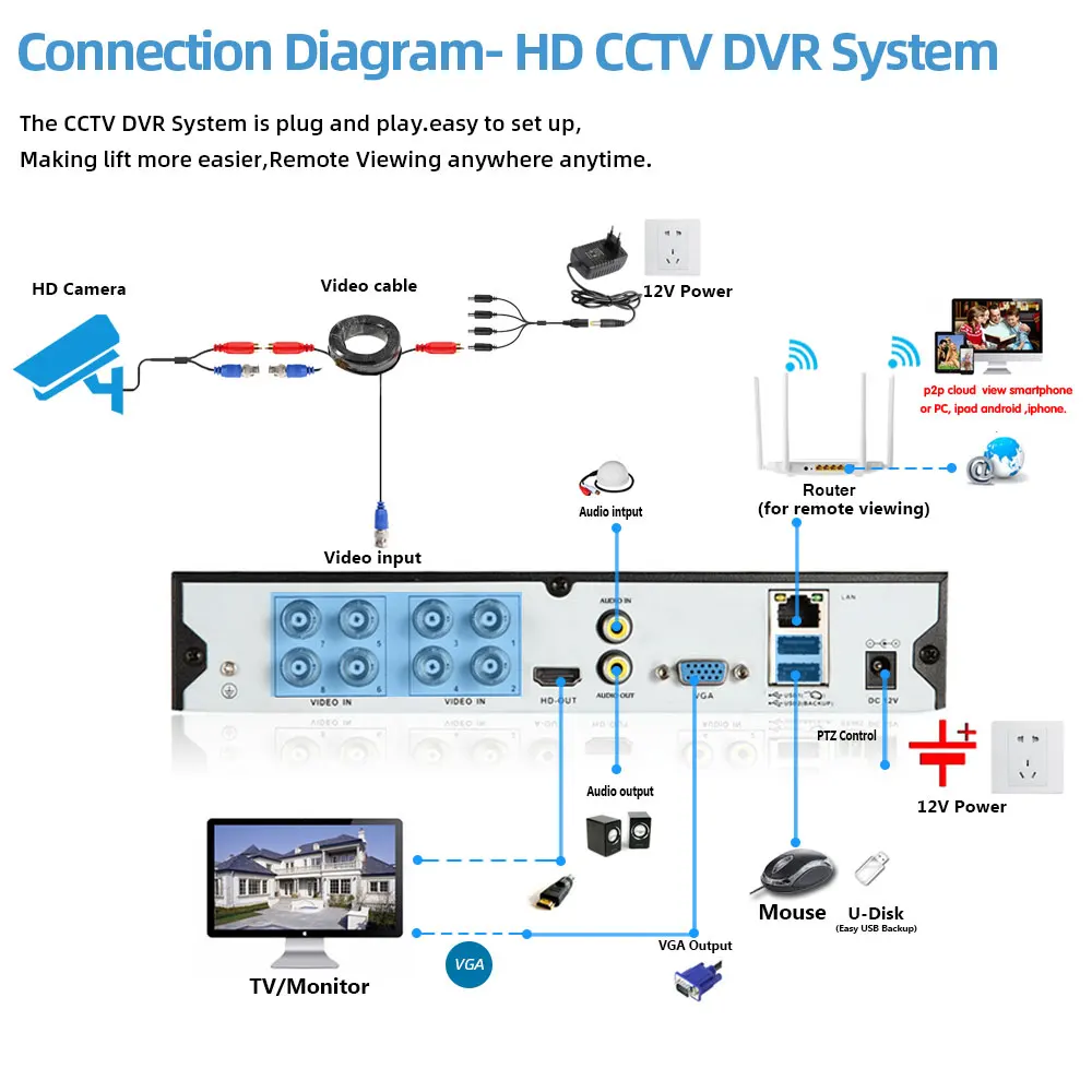 Простая настройка, всего 4 шага для просмотра мобильный телефон, просмотра видео в режиме реального времени из любого места и в любое время с помощью смартфона, стола или ПК с передовой технологией P2P, вы можете получить удаленный доступ к вашей системе за считанные минуты или меньше, нет необходимости в переадресации, удаленный доступ никогда не был таким простым!