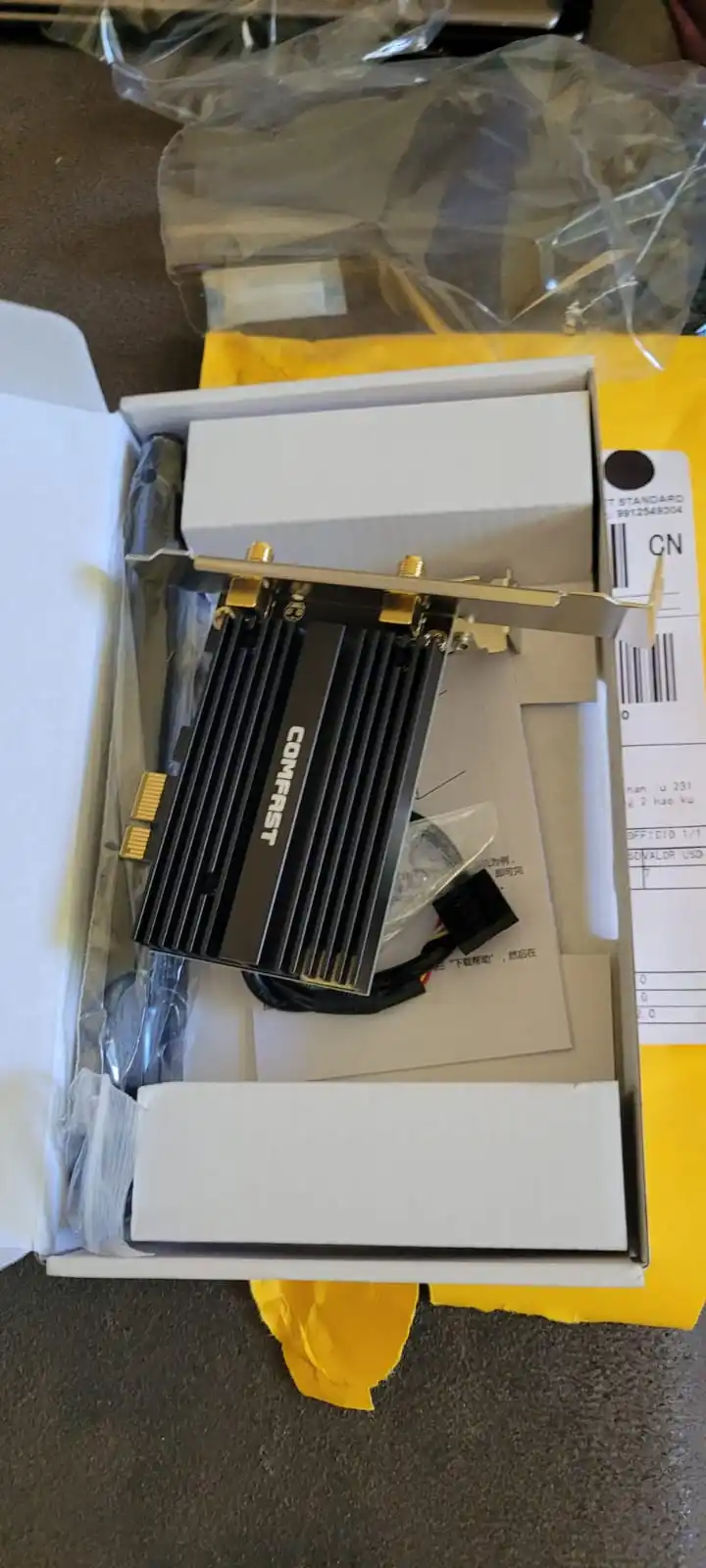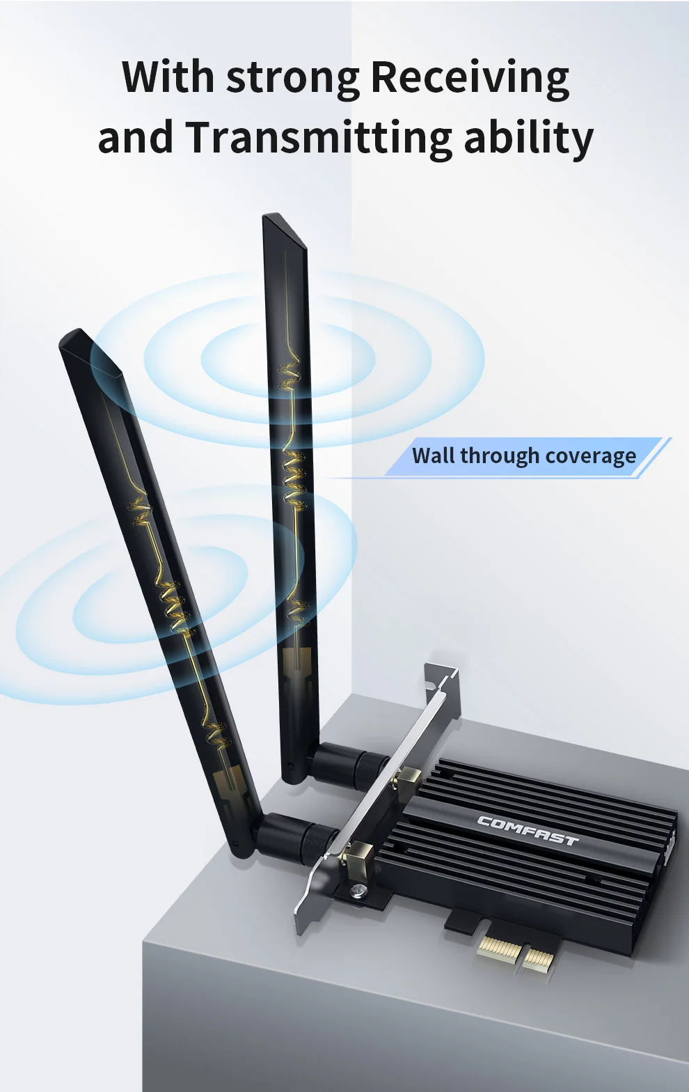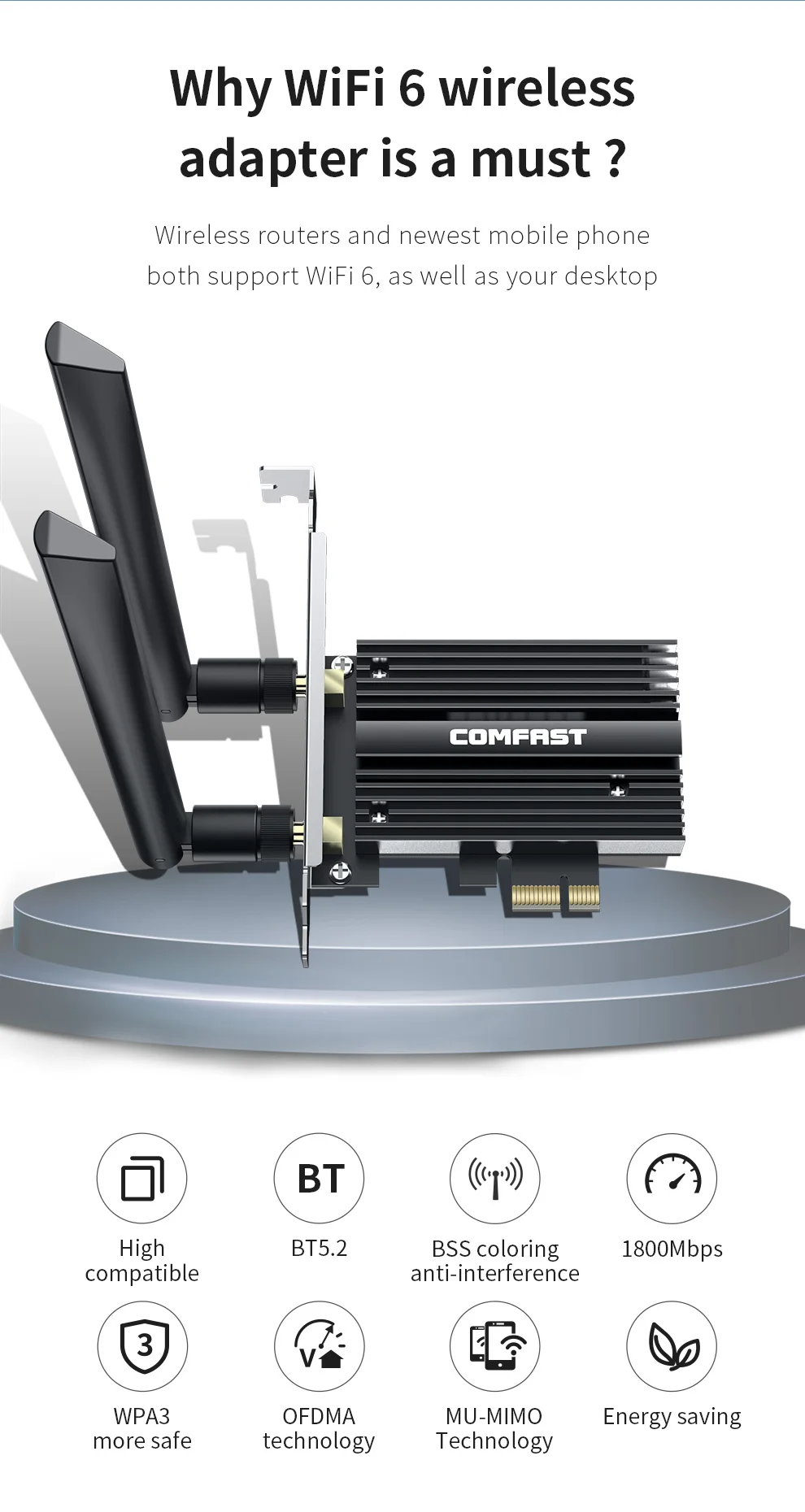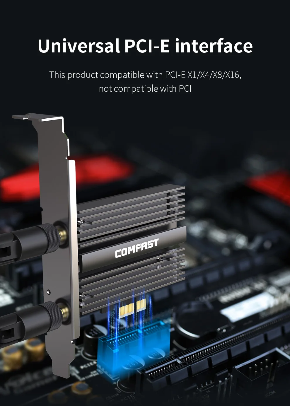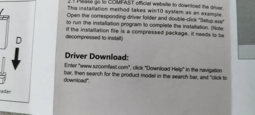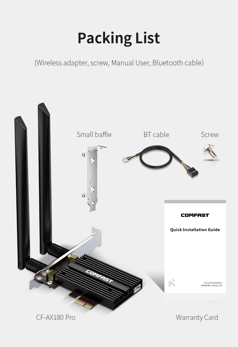 Мне понравился товар, прибыл менее чем за две недели, и мне уже удалось установить, потребовалось время, чтобы найти место, где установлен драйвер карты. Для того, чтобы скачать драйвер нужно Войдите в «Главное меню» (www.comfast.cn», а затем нажмите кнопку "[английский]" p/легче, после этого нажмите "solution" и найдите "драйверы скачать" и нажмите выше, затем появятся драйверы всех ComFast устройств, нажмите Панель поиска и поместите модель вашей карты, (В моем случае cf-ax180 pro) после нажатия на необходимую вам модель, появится совместимый драйвер, моя карта имеет два, один Wi-Fi и другие Bluetooth, так что я нажал на обоих, после загрузки, просто распакуйте и нажмите на настройку, УСТАНОВИТЕ два, затем перезапустите ПК, В случае, если Bluetooth не работает, я рекомендую изменить его внутренний USB @-@ порт, я изменил его, и он начал работать, я положил его во второй порт, А затем я переключился на первый, в случае, если Wi @-@ Fi тоже не работает, я рекомендую обновить окна 11, Я обновил, и это сработало.