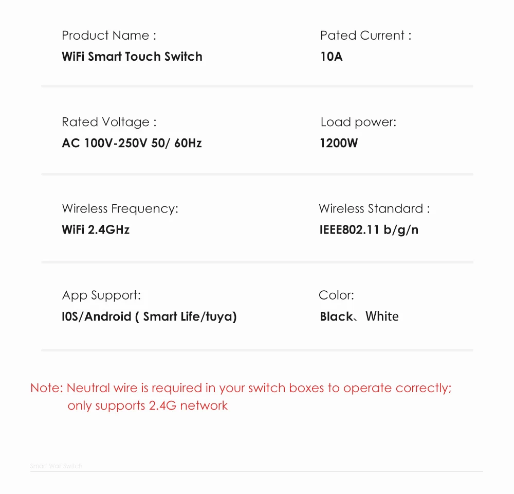 Нейтральный провод необходим в ваших коробках переключателей для правильной работы; Поддерживает только сеть 2,4G.