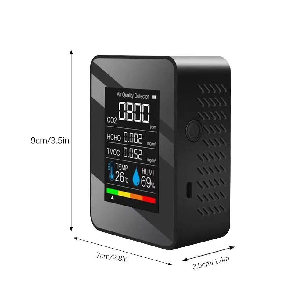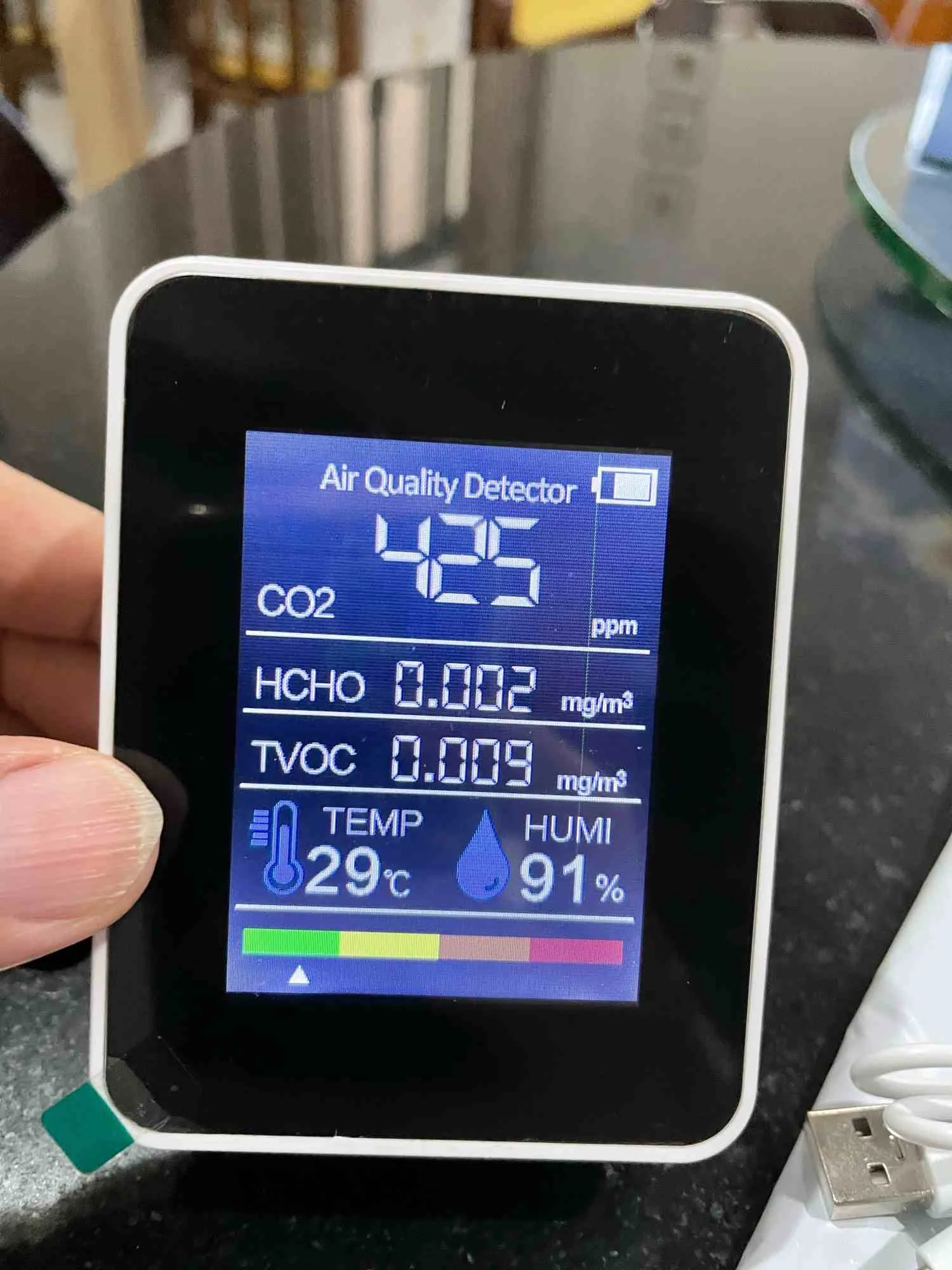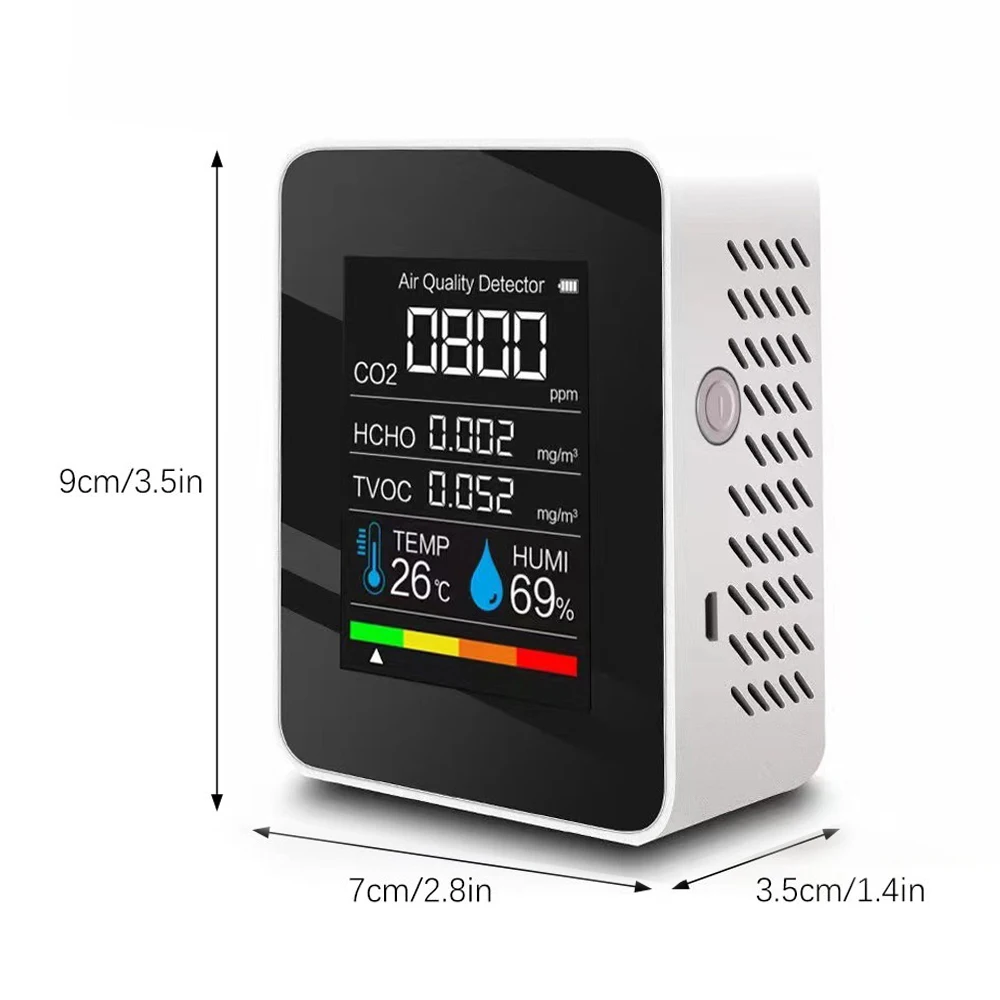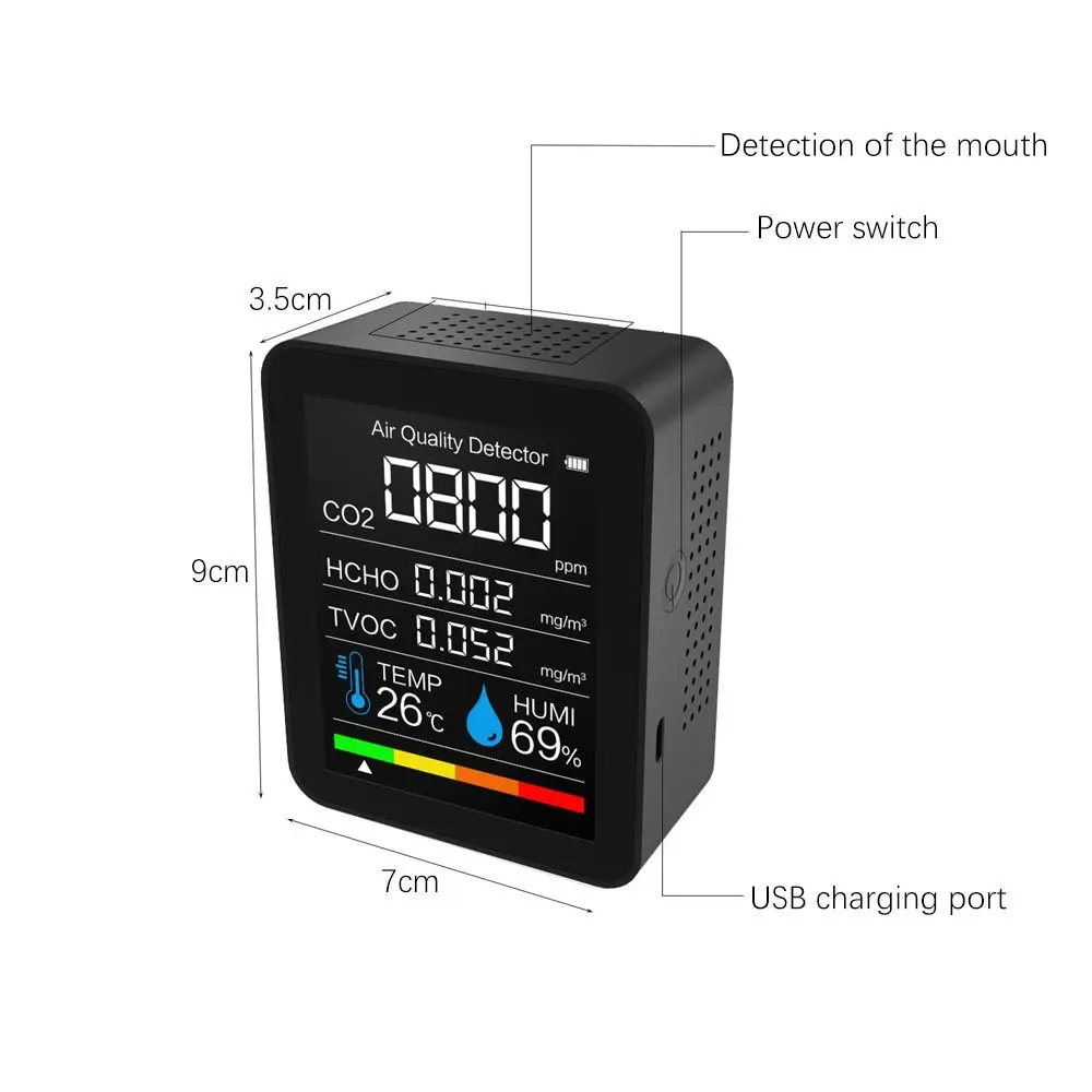 Описание:В тестере газоанализаторе смарт-значение углекислого газа используется воздушный полупроводниковый датчик TVOC для контроля температуры и влажности воздуха, содержания углекислого газа, формальдегида и летучих веществ в воздухе.Это качественный детектор качества воздуха, использующий высококачественный электрохимический модуль обнаружения, с хорошей точностью, стабильной производительностью, сильной устойчивостью к помехам, низким потреблением и долгим сроком службы.Оснащен большим экраном, различные цвета шрифта показывают различное качество воздуха, зеленый 400-450ppm, синий 451-700ppm, фиолетовый 701-1000ppm, желтый 1001-2000ppm, красный 2001-5000ppm.Продукт не нуждается в калибровке, может быть протестирован после запуска и может точно обнаруживать углекислый газ.Характеристики:Название: детектор углекислого газаМатериал: АБС-пластикЦвета: белыйРазмер: 9x7x3.5смЭкран Размер: 2,8 дюймовТип экрана: TFT-LCDРазрешение экрана: 240*240Время отклика: <1sДиапазон температур: от-10 ℃ до 70 ℃Диапазон измерения влажности: 0-99% RHРабочее напряжение: 5 В/1 а адаптер зарядкиМаксимальная мощность: 600mA зарядный ток никель-металл, 3,7 V литиевая батарея источника питания батареиЕмкость аккумулятора: 1200 мАчТип батареи: литиевая батареяСпособ зарядки: USBВремя зарядки: 1 часПримечания:Возможны небольшие погрешности в размере при ручном измерении.Отклонение цвета может отличаться из-за различных настроек монитора, пожалуйста, поймите.Упаковочный лист