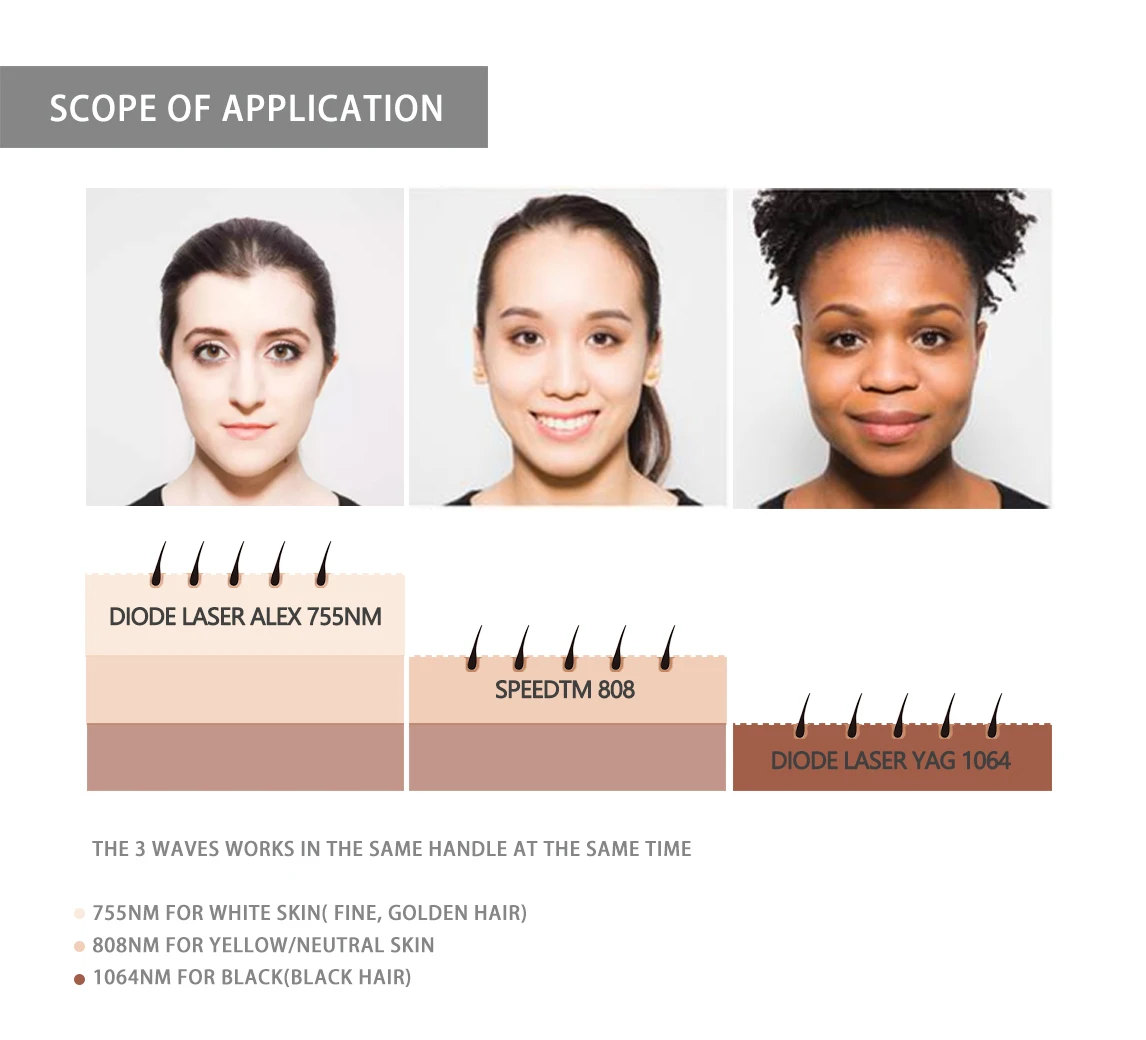 808нм диодный лазерПозволяет светильник глубже проникать в кожу и безопаснее, чем другие лазеры, потому что он может избежать пигмента меланина в эпидермисе кожи. Мы можем использовать его для постоянного уменьшения волос всех цветов волос на всех 6 типах кожи, включая загорелую кожу.