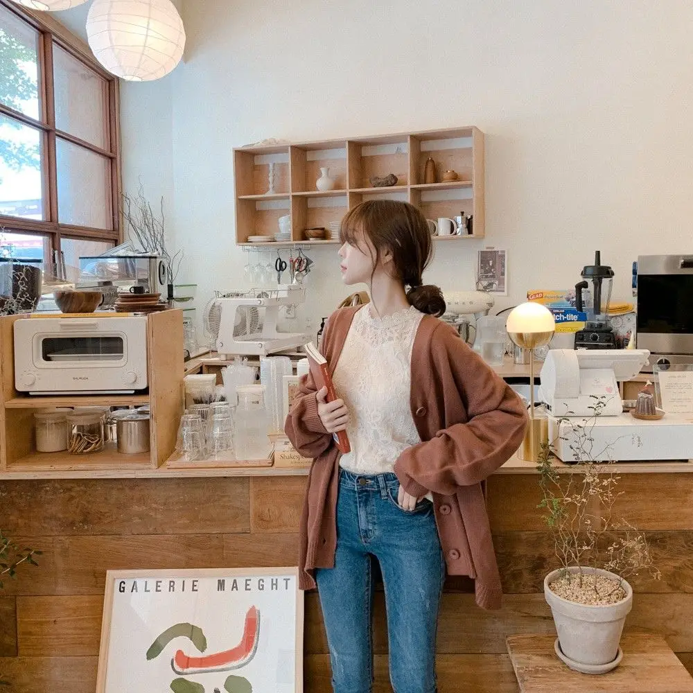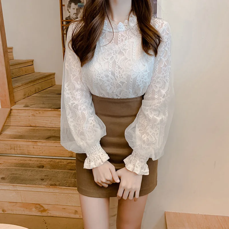 Винтажная кружевная ажурная рубашка с цветочным узором, корейские модные газовые пуловеры с воротником-стойкой и рукавами-фонариками, женская одежда, элегантные блузки
