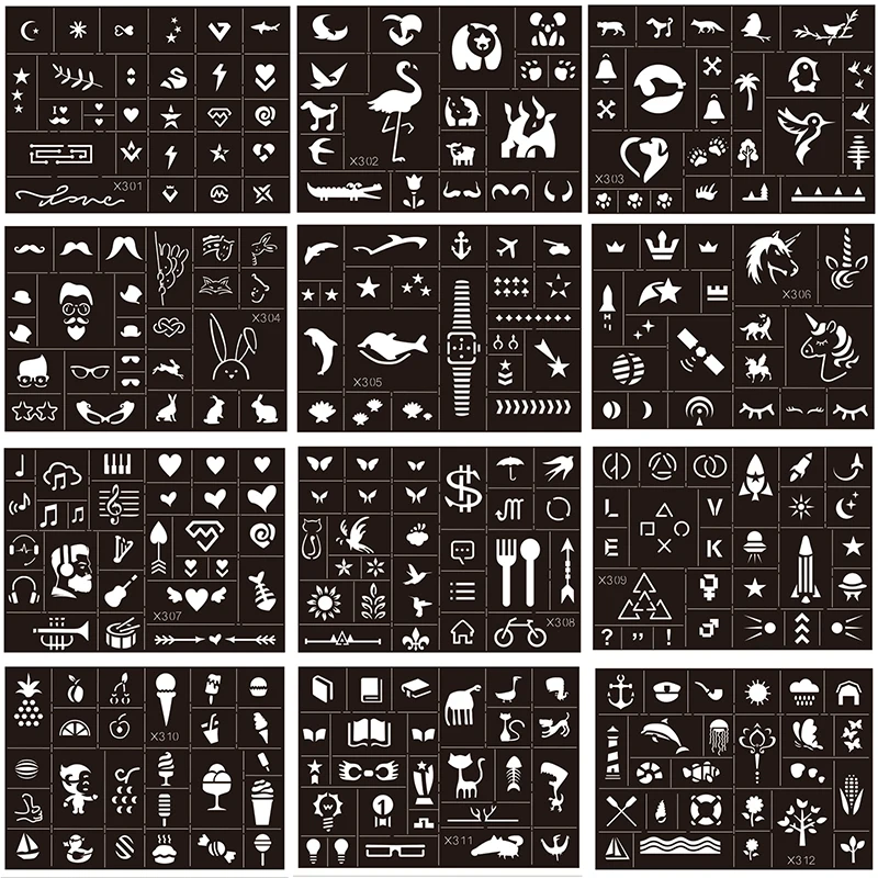 296 шт., трафареты для татуировок для мальчиков и девочек, 12 листов