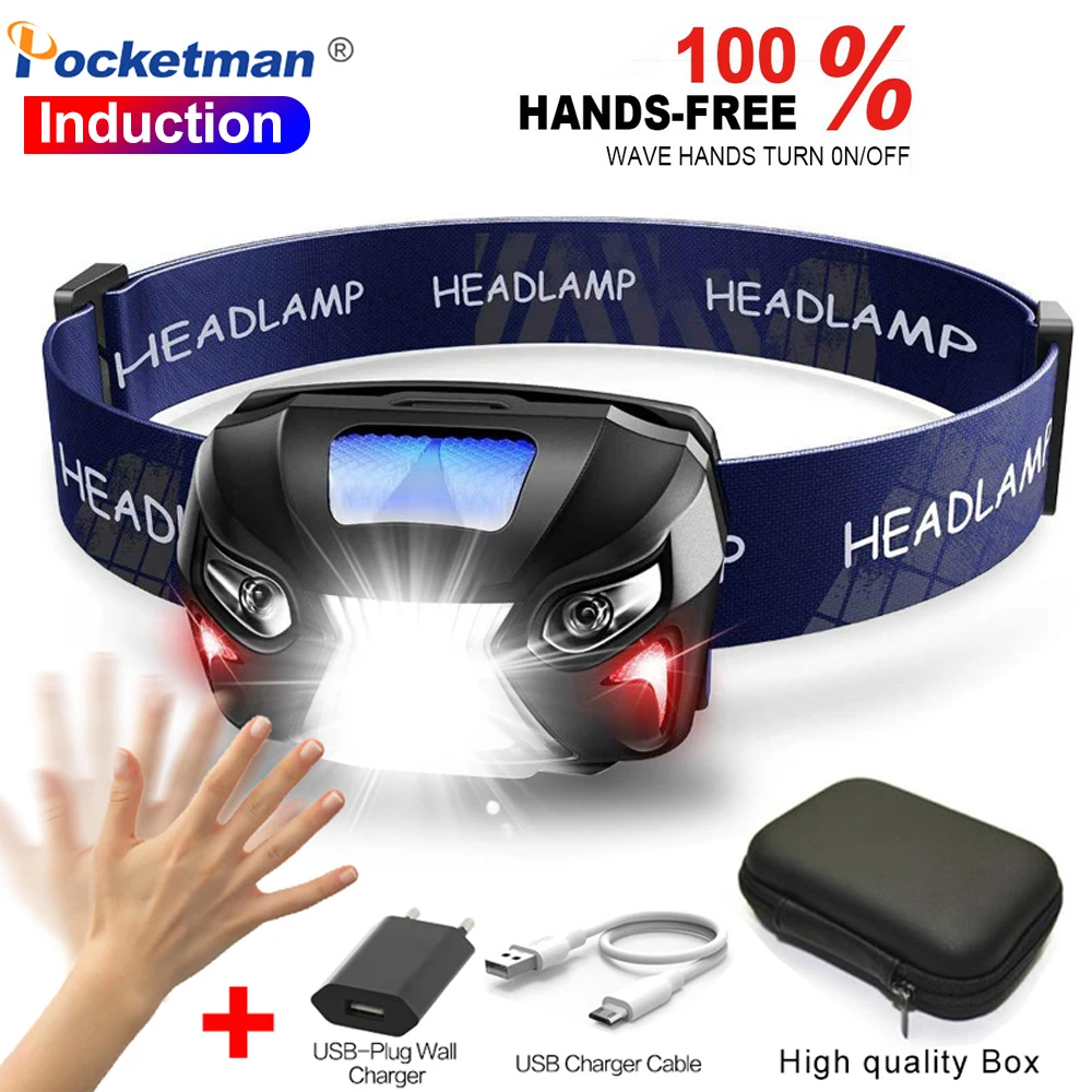 Мощный датчик движения тела налобный фонарь светодиодный светильник USB перезаряжаемая головка флэш-светильник Кемпинг Рыбалка Пешие прогулки головной светильник