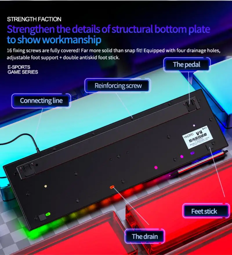 5,16 крепежных винтов полностью покрыты, что более Долговечно, чем обычные клавиатуры! Оснащен 4 дренажными отверстиями, регулируемые двойные опоры для ног, двойные Нескользящие наклейки для ног.