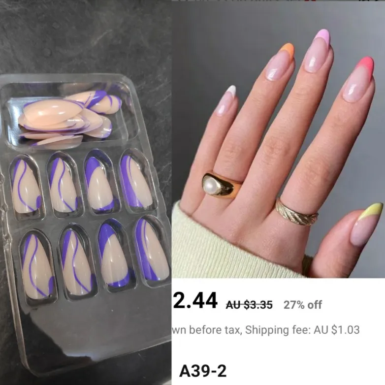 На мой взгляд не самый красивый набор ногтей. Градиент слишком персиковой и не такой розовый обнаженный на фото. Форма тоже не соответствует, однако они подходят и поставляются с липким клеем. Также примеры других наборов от продавца.