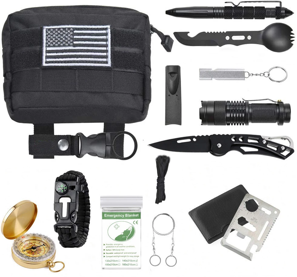 Набор для выживания molle тактический Чехол в комплекте:Тактическая ручка, ложка, вилка, нож со свистком, свисток, многофункциональный светодиодный фонарик, нож для выживания, многофункциональный нож для карт, аварийное одеяло, браслеты для выживания, Золотой компас, зажим для бутылки воды, Проволочная пила, тактическая Сумка.