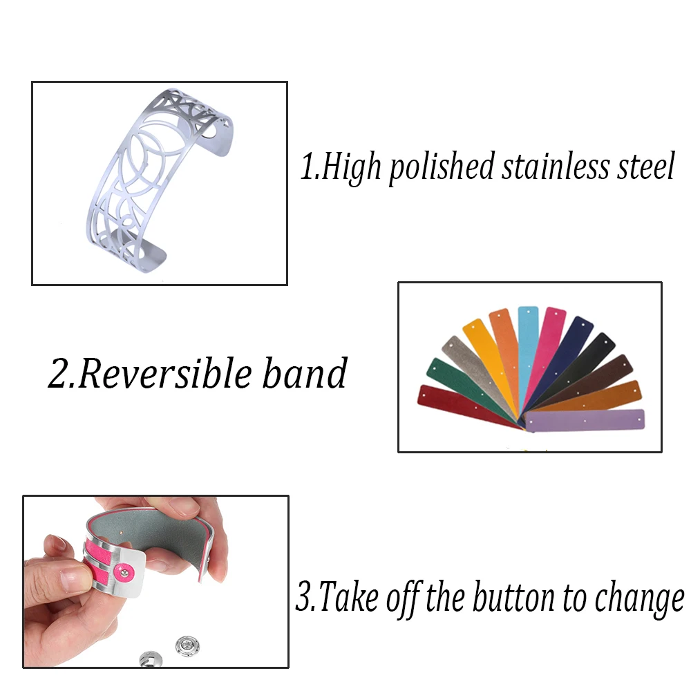 Информация: Браслет-манжета Тип: браслет из нержавеющей стали. Материал: нержавеющая сталь + браслет из искусственной кожи. Пол: все Для женщин. Сатл: около 14 мм/15,5 г, 25 мм/22,5 г, 40 мм/35 гр. Дизайн: двусторонний Браслет-манжета из искусственной кожи DIY. Повод: Свадьба, помолвка, юбилей, вечерние, подарок на день Святого Валентина. Примечание: 1. DIY браслет ювелирные изделия, полированный, регулируемый, Реверсивный взаимозаменяемый кожевенный. 2. Удобное Сенсорное стекло. Уникальное творчество, один браслет, весь мир. 3. Мы стремимся производить высококачественные товары с гламурным, продуманным и креативным дизайном
