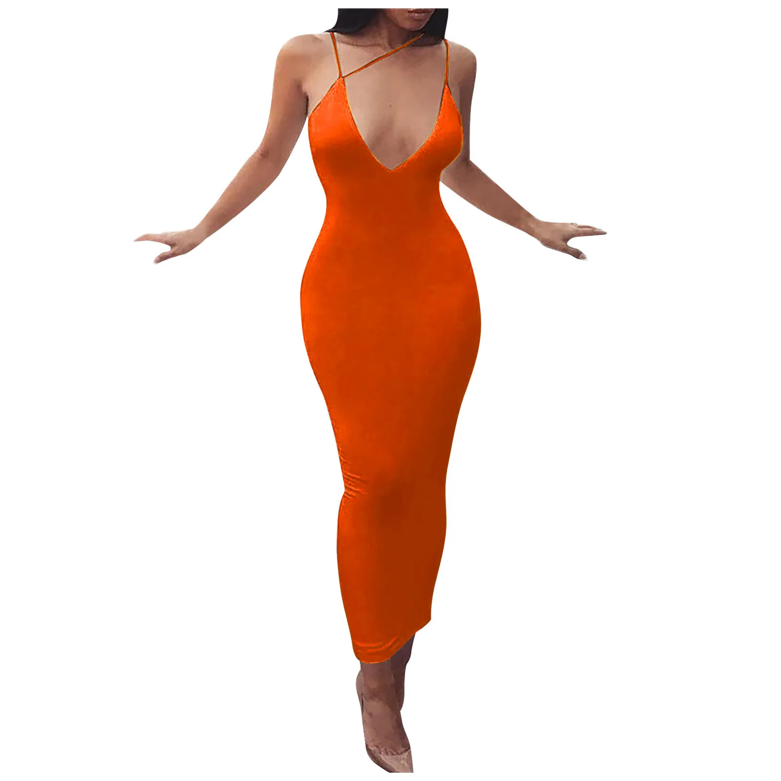 Вечерние платья на бретелях-спагетти, Женское однотонное длинное Платье с V-образным вырезом и лямкой на шее, цельное облегающее Платье, летние платья, Женское Платье 2021