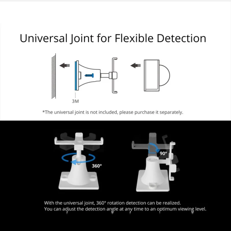 С универсальным соединением, датчик может быть гибким, чтобы вращать полный 360 ° Горизонтальный угол и 90 ° Вертикальный угол, который позволяет регулировать датчик в оптимальный угол, чтобы просмотреть все в вашем доме (датчик не двигается самостоятельно на основе ваших предложений). Еще одним удобством для вашего дома является то, что вы можете использовать датчик для положения, где движение не легко быть обнаружено путем установки его в универсальном соединении, И просто поверните универсальную шарнирную головку, чтобы получить прекрасный угол обнаружения. Кроме того, вы можете непосредственно наклеить датчик на поверхность объектов для обнаружения движения. Просто выберите тот, который вам нравится.