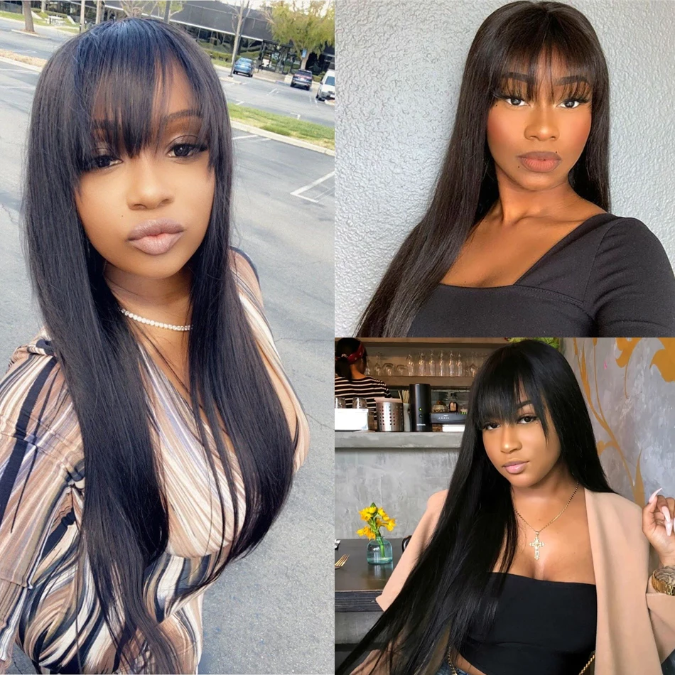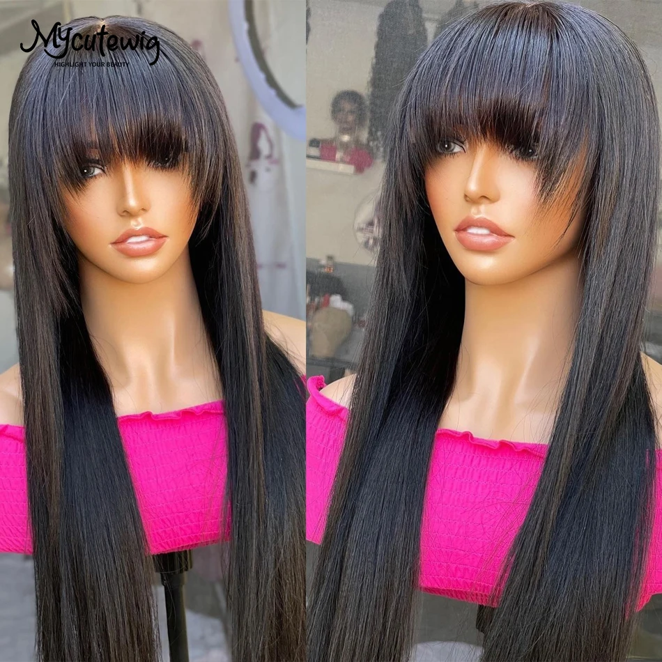 Прямые парики из человеческих волос с челкой, парик полностью машин...