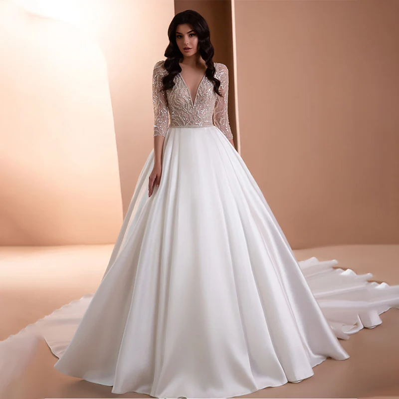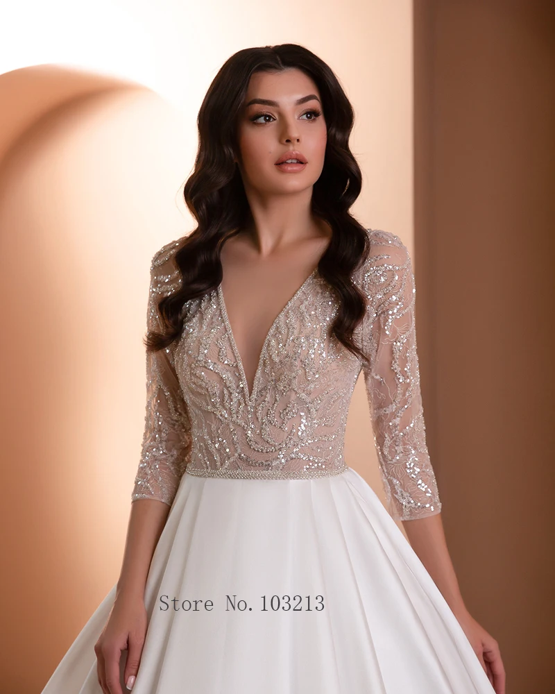 Роскошное блестящее свадебное платье-трапеция Vestido De Noiva с глубоким V-образным вырезом и рукавом 34, прозрачное атласное платье с открытой спиной на заказ