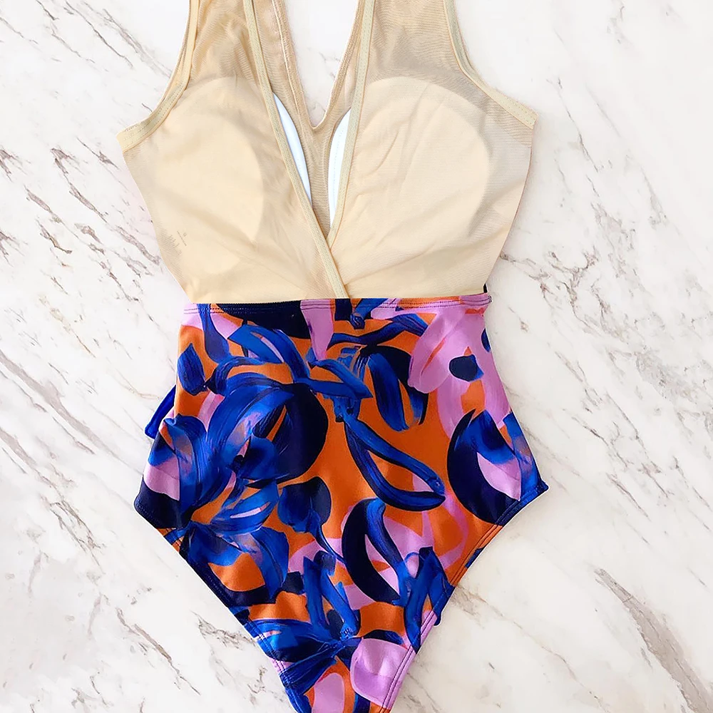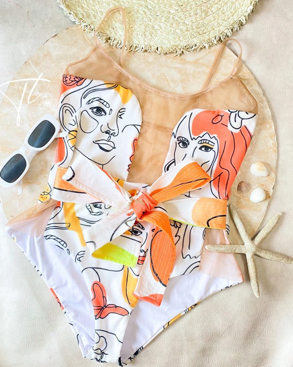 Цельный купальный костюм 2022, сексуальная сетчатая одежда для плавания, женский купальник с поясом, пляжная одежда, купальный костюм с принтом, монокини для плавания