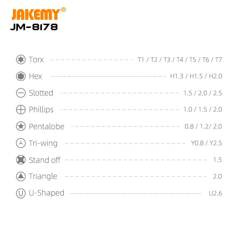 Прецизионная отвертка набор многоразрядных отверток:-- Torx: T1/T2/T3/T4/T5/T6/T7-- Hex: H1.3/H1.5/H2.0-- Прорези: 1,5/2,0/2,5-- Phillips: 1,0/1,5/2,0-- Pentalobe: 0,8/1,2/2,0-- Три крыла: Y0.8/Y2.5-- Выключается: 1,5-Трехугольные: 2,0-- U-образный: U2.6Особенности:-- Таможенный приходной ордер биты Материал-- Регулируемые отвертки для различных винтов.-Обычно используется в электронике, моделях DIY, ювелирных изделиях, очках и других бытовых приборах.Комплект поставки:1 * JAKEMY набор отверток