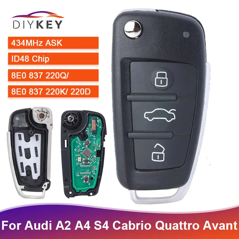 Пульт дистанционного управления DIYKEY с 3 кнопками, 433 МГц, для AUDI A2 A4 S4 Cabrio Quattro Avant 2005 2006 2007 ID48 Chip 8E0 2008 220Q K D