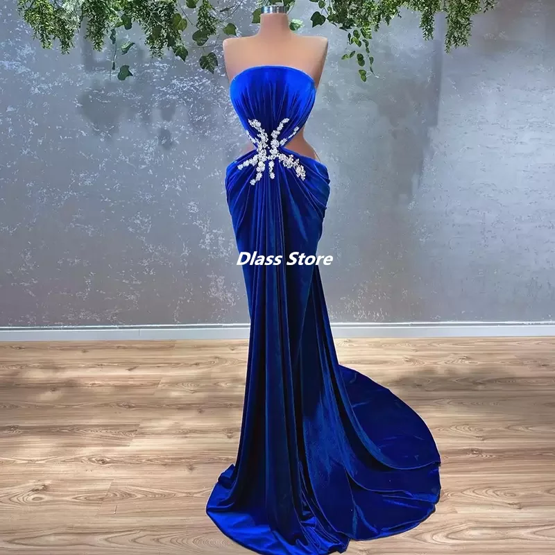 Женское вечернее платье с юбкой годе, синее платье для выпускного вечера с бархатными бусинами, без бретелек, Роскошные вечерние платья на заказ, Новинка