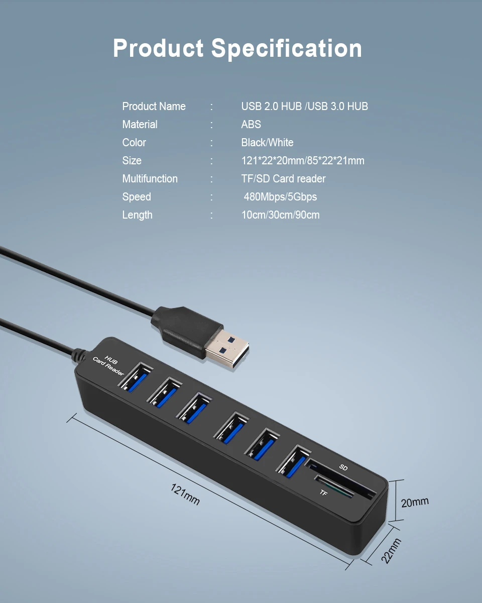 Товар Naam: usb-хаб Combo<;br/> Тип USB: USB 2,0 <;br/>Datum Overdrachtsnelheid: Tot 480 Мбит/с <;br/>USB-poorten: 3/6 Poorten<;br/>Kaartlezer: Voor SD/TF (Micro SD) Kaart<;br/>Materiaal: ABS Shell<;br/>Vermogen: 5 В/500 мА <;br/> Совместимость: Windows XP/2000/Vista/WIN 7/8/10, Mac OS и т. Д.