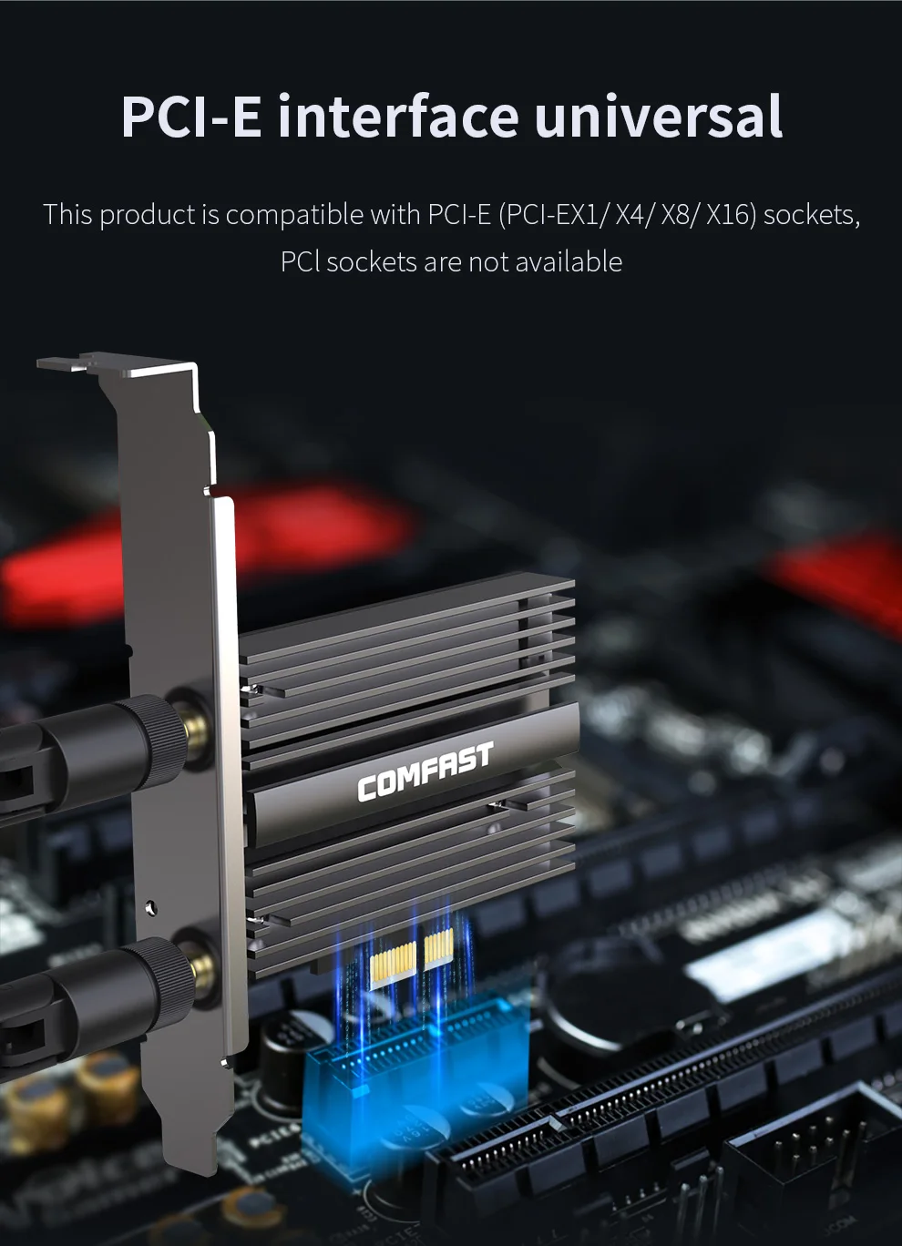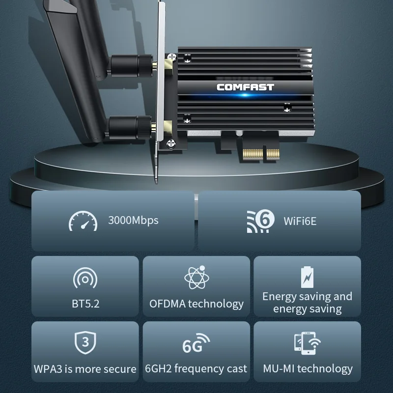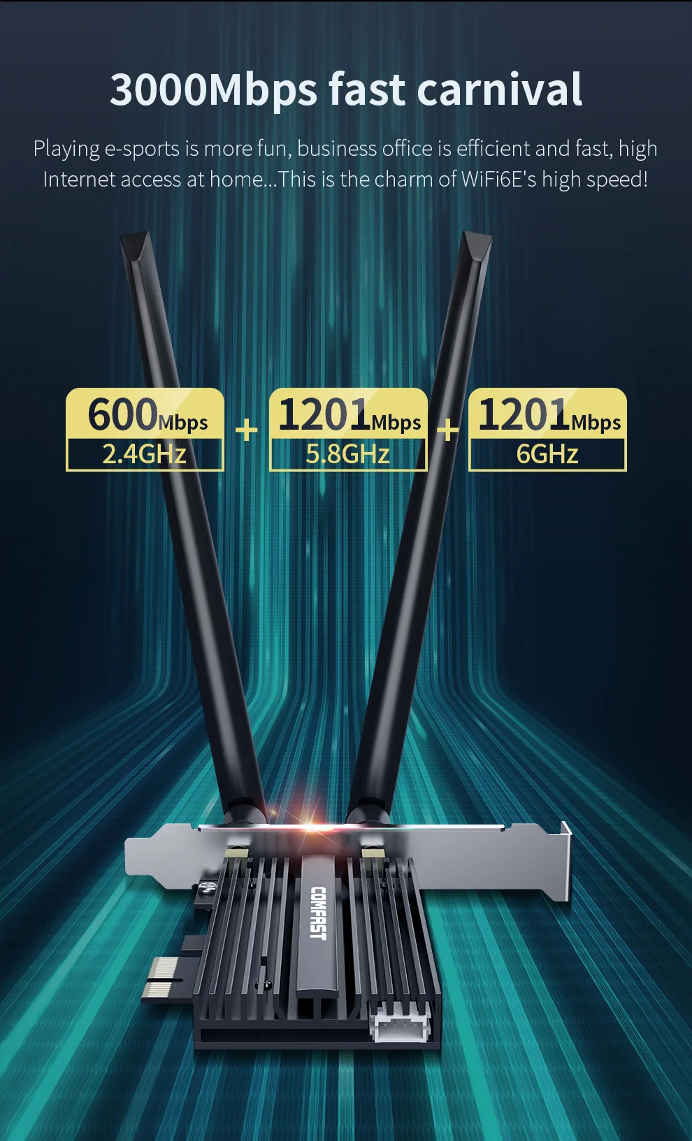 CF-AX181 Pro:WiFi6EBT5.23000 Мбит/с трехдиапазонный 2,4G и 5G и 6 ГГцPCI-E сетевая карта Поддержка IEEE 801.ax с2 * 5dBi антенны и радиатор