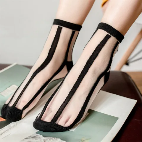Популярные стеклянные носки, модные шелковые дышащие сетчатые черные белые тонкие милые носки, повседневные прозрачные Модные женские носки с принтом в Корейском стиле