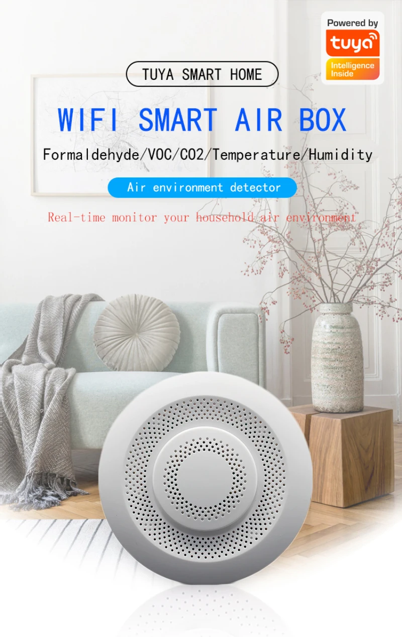 2. После подключения к приложению, он может быть связан с различными продуктами smart home. Например, при обнаружении чрезмерного формальдегида/Лос умный очиститель воздуха автоматически включается; Когда превышен углекислый газ, Умный вентилятор свежего воздуха автоматически включается; Когда температура ненормальная, температура кондиционера автоматически регулируется; Когда влажность слишком низкая или слишком высокая, Смарт-увлажнитель будет включаться/выключаться автоматически; Когда определённый параметр будет обнаружен, чтобы превысить стандарт, на будильник будет отправлено сообщение (вышеуказанная функция умной связи должна быть совместима с продуктом smart home)