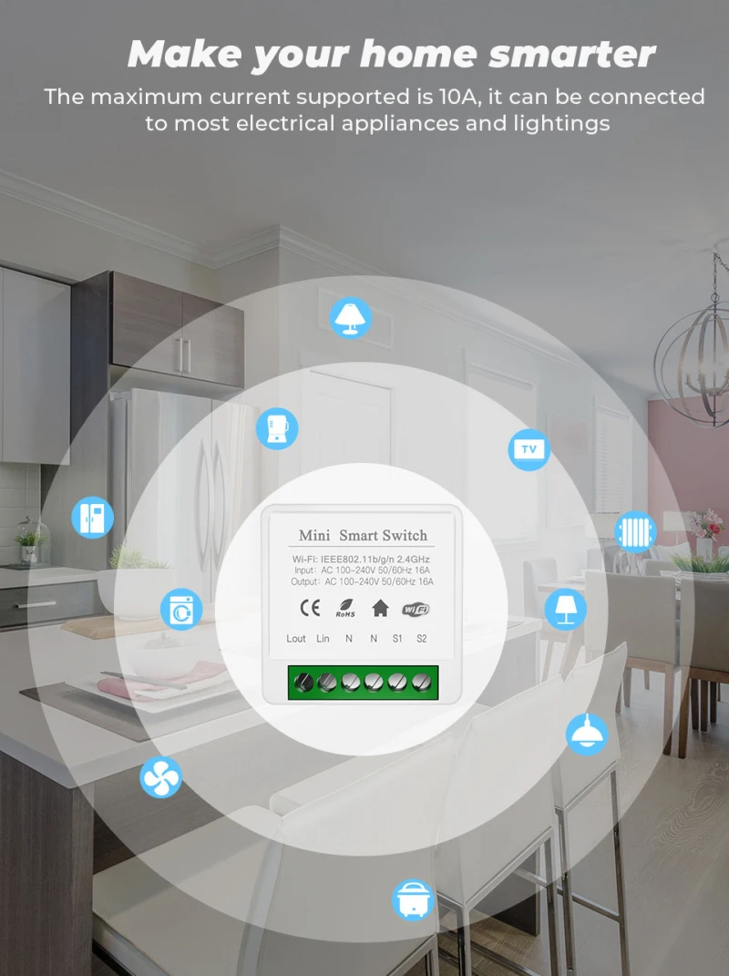 Например, переустановка настольной лампы в умную настольную лампу, и мобильный телефон может управлять переключателем светильник. Чтобы превратить светильник вниз в умный вниз светильник, вам нужно только подключить модуль smart switch к переключателю, а затем Alexa/Google assistant может управлять переключателем светильник.