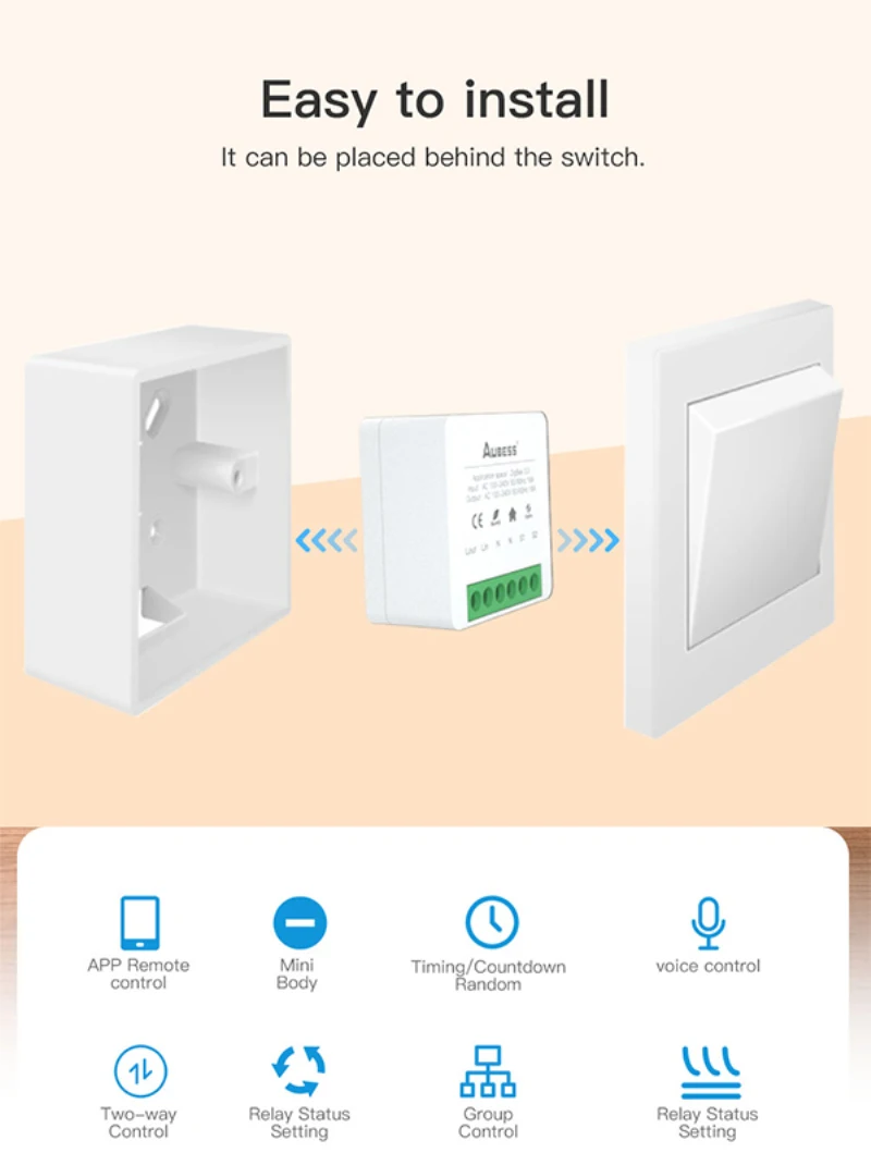 Его также можно подключить за переключателем для поддержки одного переключателя управления и двойного переключателя управления. Он может быть непосредственно установлен в коробке переключателя, чтобы скрыть модуль переключателя. Он также может быть установлен на двойном переключателе управления, не влияя на использование двойного переключателя управления.
