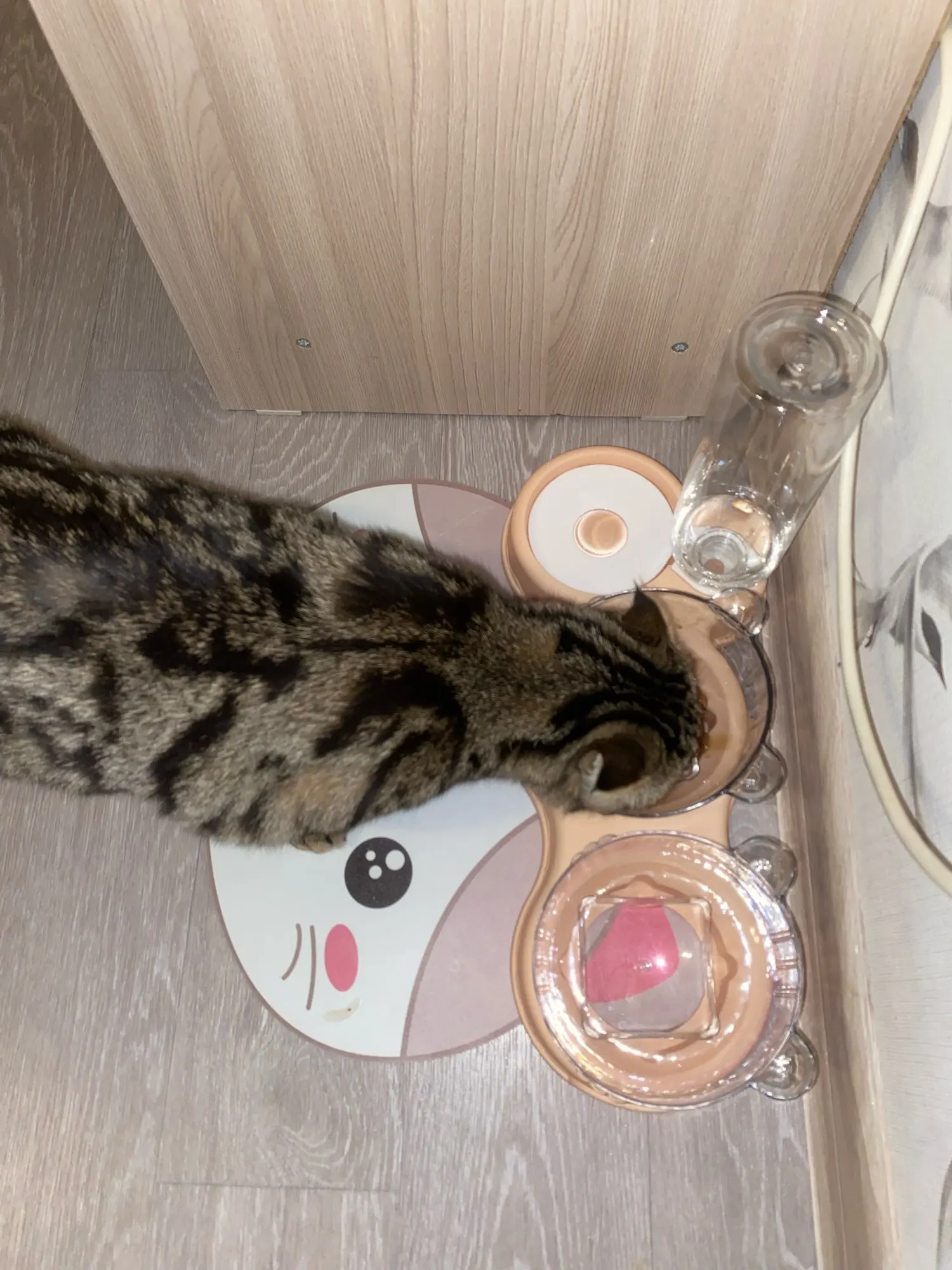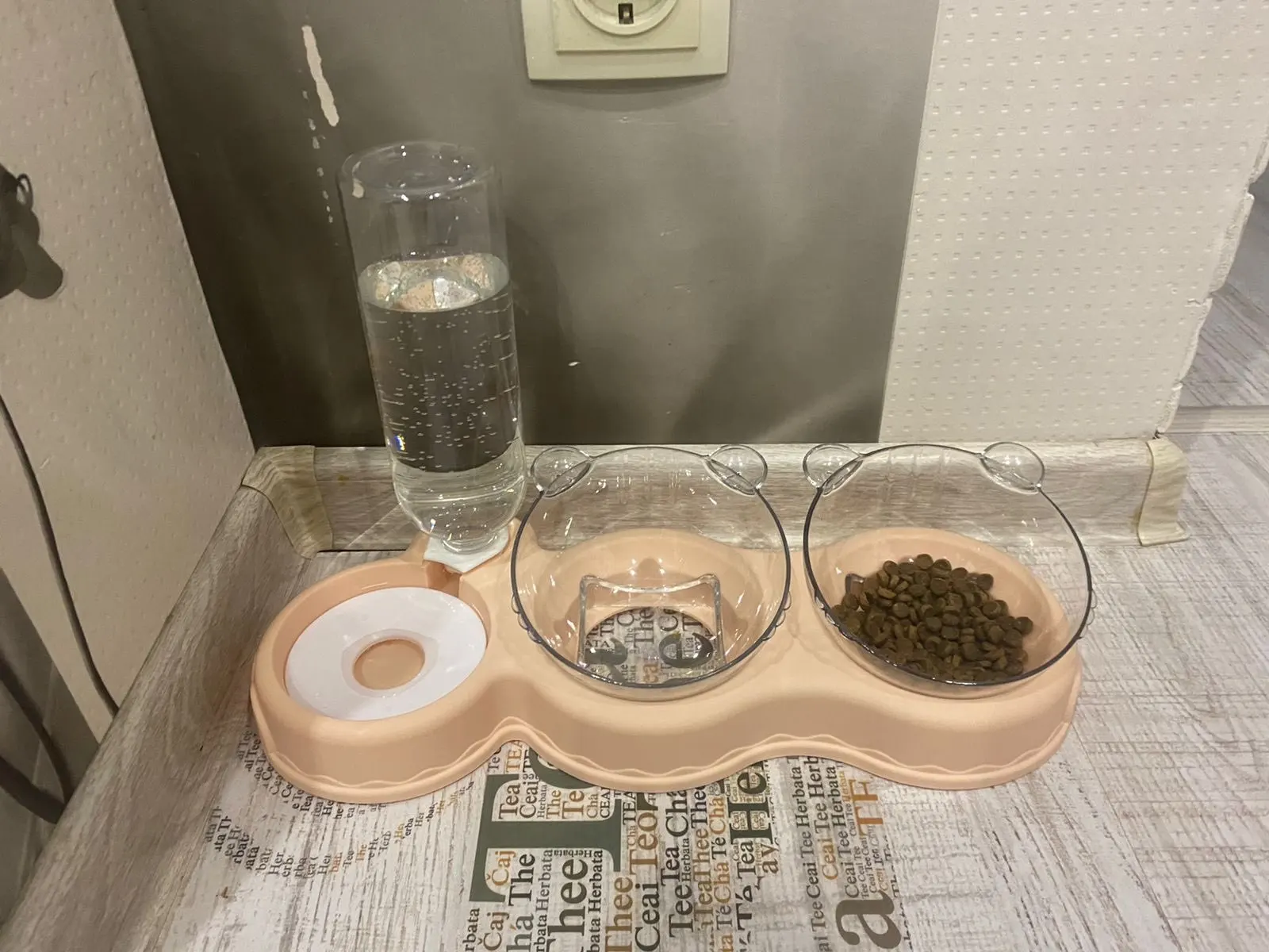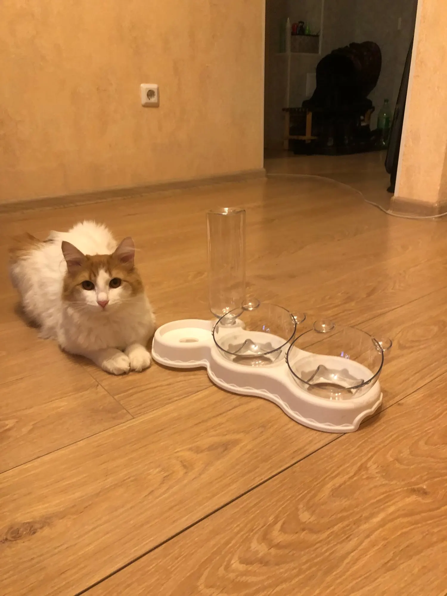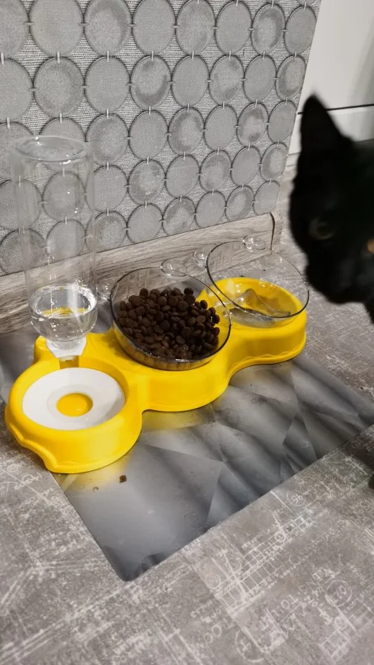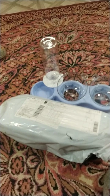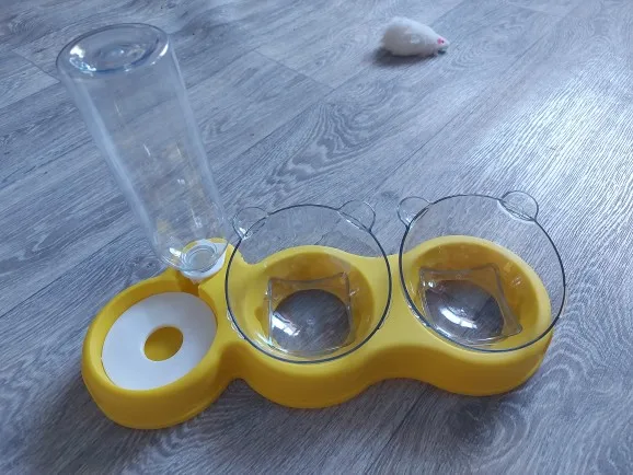 Очень милая кормушка. Мисочки глубокие, есть наклон, удобно. Было хорошо упаковано, спасибо продавцу, но бутылочка слегка помялась, не критично. Котики оценили обновку))