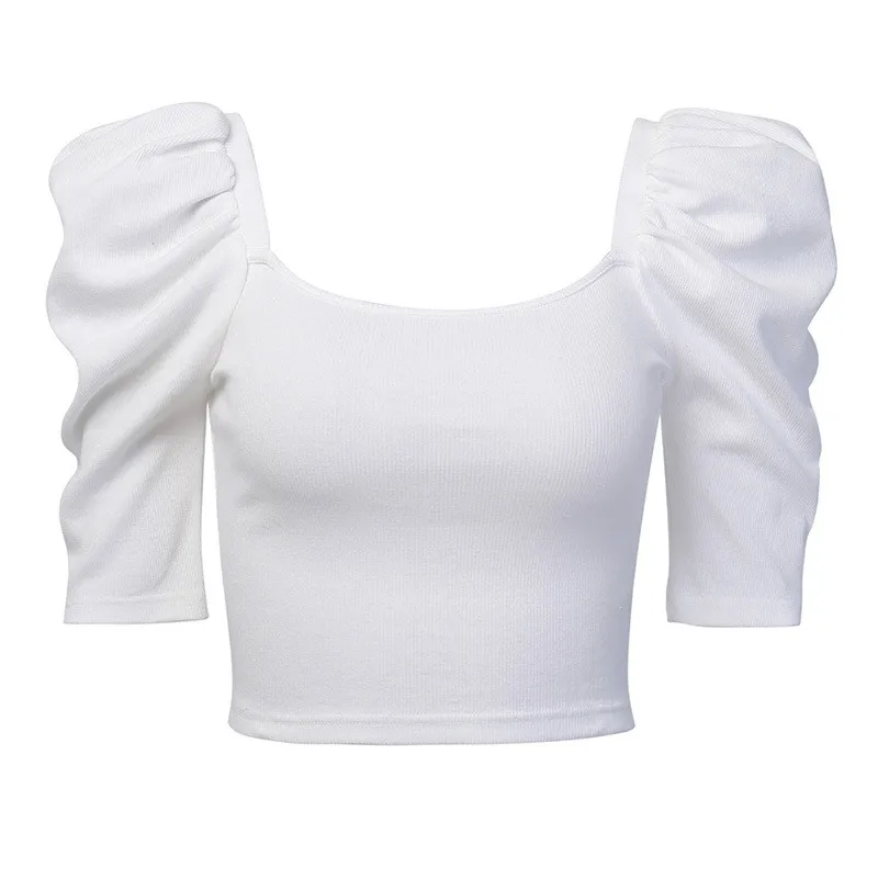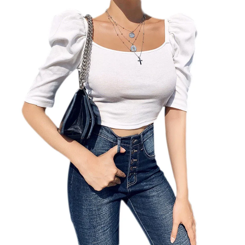 Женская футболка с пышными рукавами, облегающая эластичная футболка в рубчик с квадратным вырезом, однотонные повседневные укороченные топы в стиле High Street, размеры S, M, L, на лето