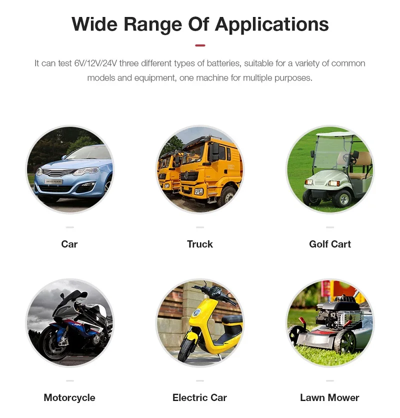 Он может протестировать батареи 6 В/12 В/24 В, подходит для различных общих моделей и оборудования. (Для мотоциклов, автомобилей, газонокосилок, гольф-машин, квадроциклов, грузовиков, лодочных аккумуляторов)