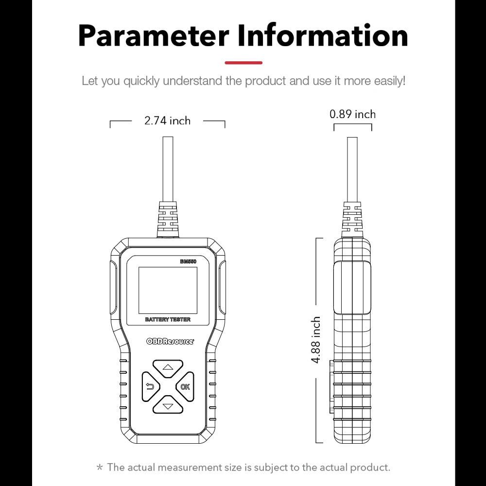 * Название продукта: Тестер батареи* Модель: OBDResource BM550* Размер экрана: 1,8 дюймов высокой четкости дисплей с подсветкой* Диапазон испытаний: 6 В/12 В/24 В* Способ подключения: положительный и отрицательный зажим• Операционная Напряжение: 4,9 V ~ 32В* Рабочая температура: -4 °F ~ 122 °F (-20 °C ~ 50 °C)* Размер продукта: 4,88x2,74x0,89 дюйма (124x69,6x22,6 мм)* Материал изделия: внутренний материал ПВХ