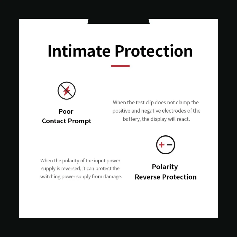 1. Плохой контактКогда тестовый зажим Не зажимает положительные и отрицательные электроды батареи, дисплей будет реагировать.2. Полярность обратной защитыКогда полярность входного источника питания изменяется, он может защитить переключение питания от повреждений.