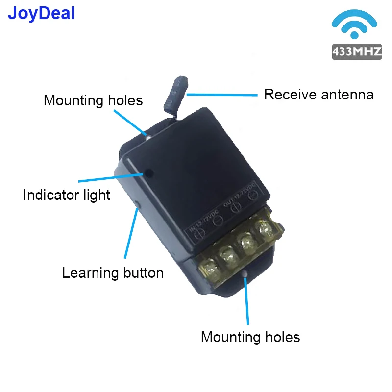 Изучение кода: (мгновенный)Нажмите клавишу обучения (на приемнике) один раз, светодиодный (на приемнике) будет мигать один раз. Когда светодиодный индикатор включен, нажмите кнопку дистанционного управления (вы хотите, чтобы он учился), светодиодный (на приемнике) мигнет 3 раза, а затем выключится, учитесь преуспевать.Изучение кода: (переключение)Нажмите клавишу обучения (на приемнике) 2 раза, светодиодный (на приемнике) начнет мигать 2 раза.Когда светодиодный индикатор включен, нажмите кнопку дистанционного управления (вы хотите, чтобы он учился), светодиодный (на приемнике) мигнет 3 раза, а затем выключится, учитесь преуспевать.