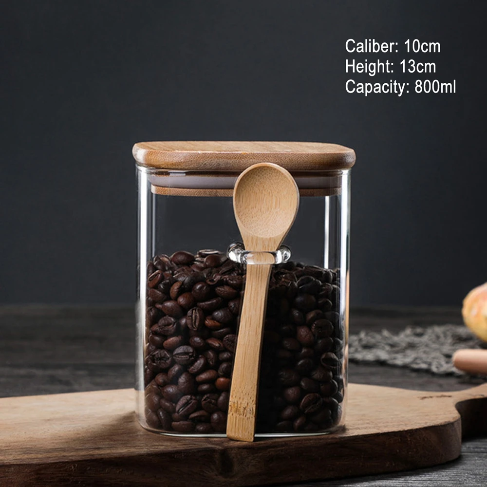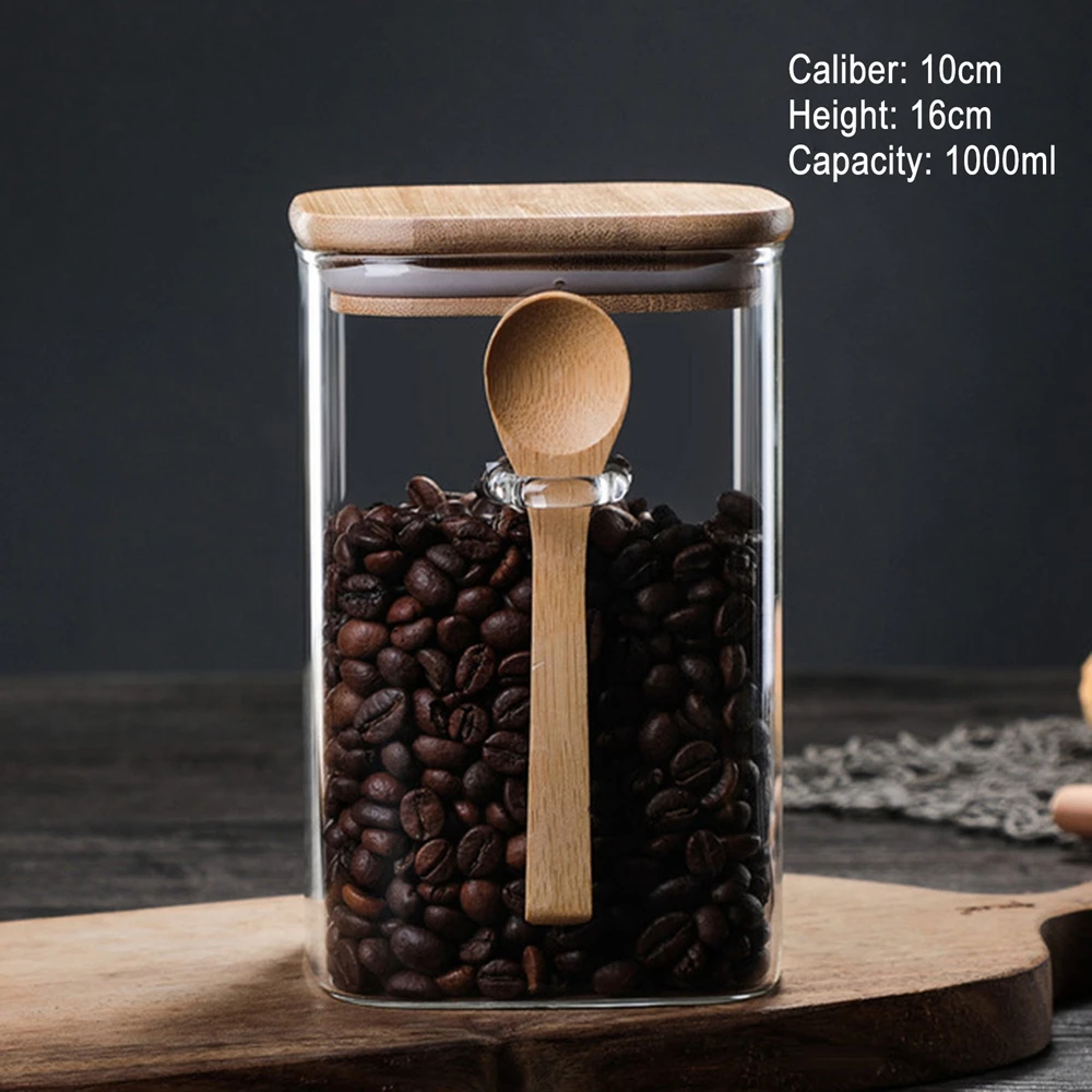 Квадратная стеклянная герметичная банка, кухонный резервуар для хранения с деревянной ложкой и крышкой, контейнер-бак для кофе, зерен, злаков, орехов