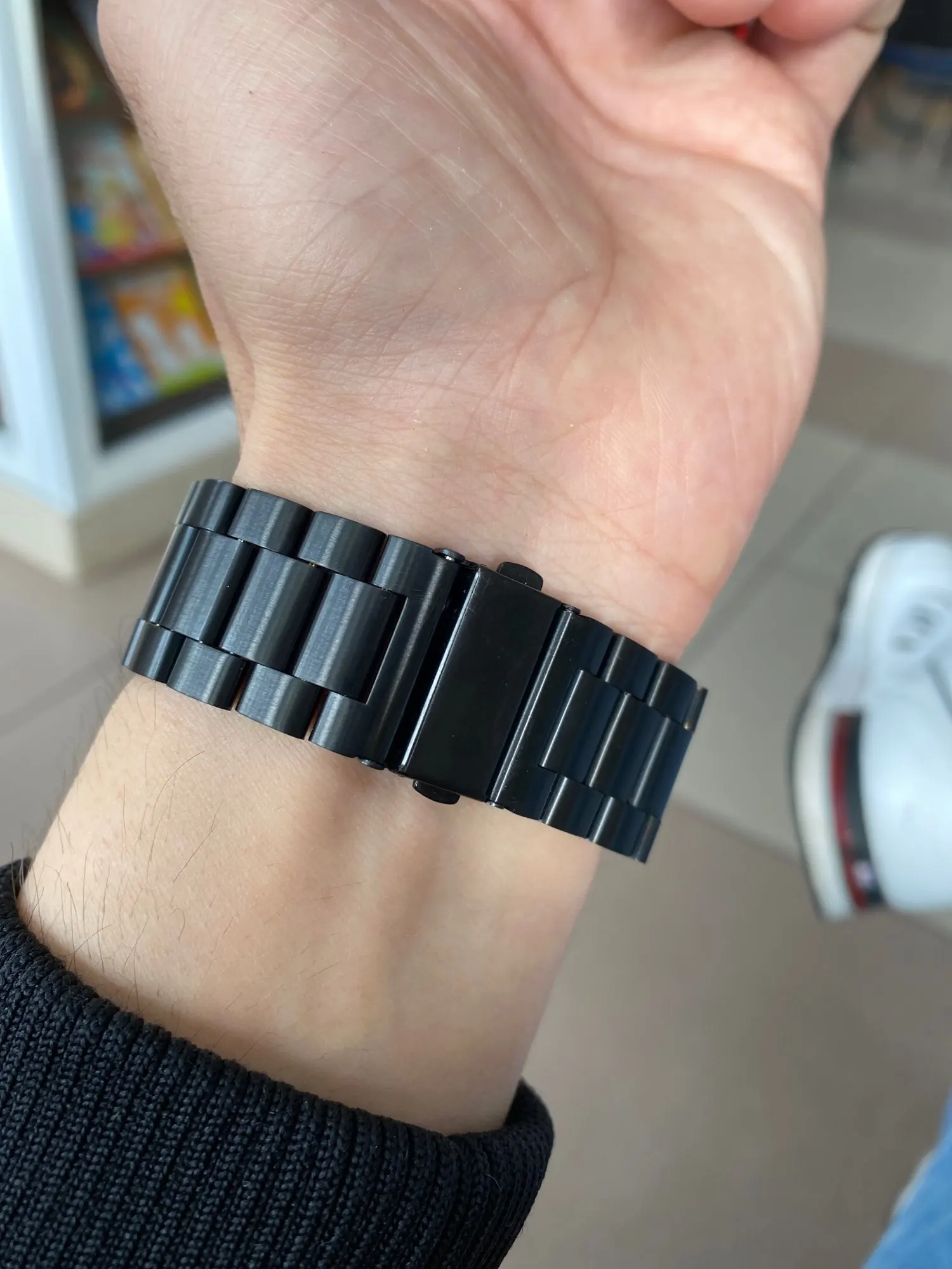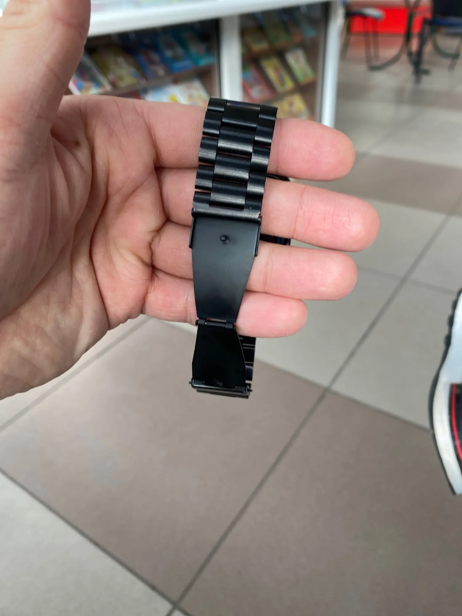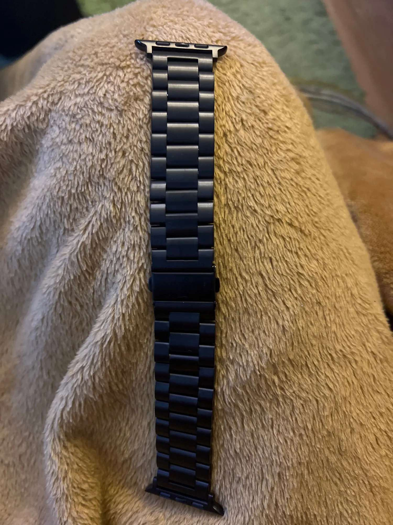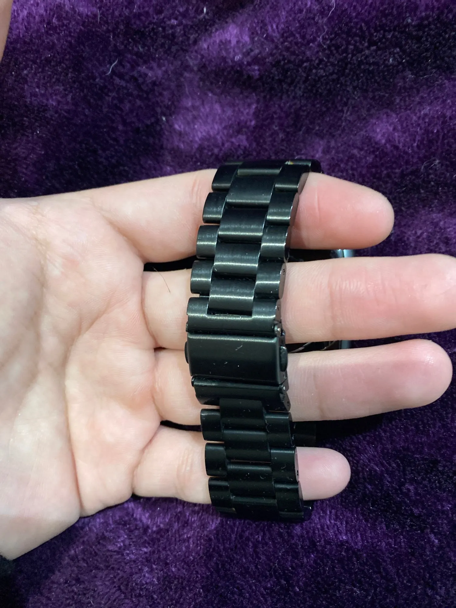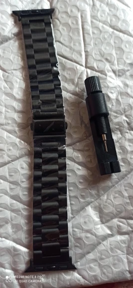 Довольно дешевый металлический ремешок, размер подогнал довольно точно, в целом хорошо, можно купить несколько. Думаю краска сотрется быстро с него.