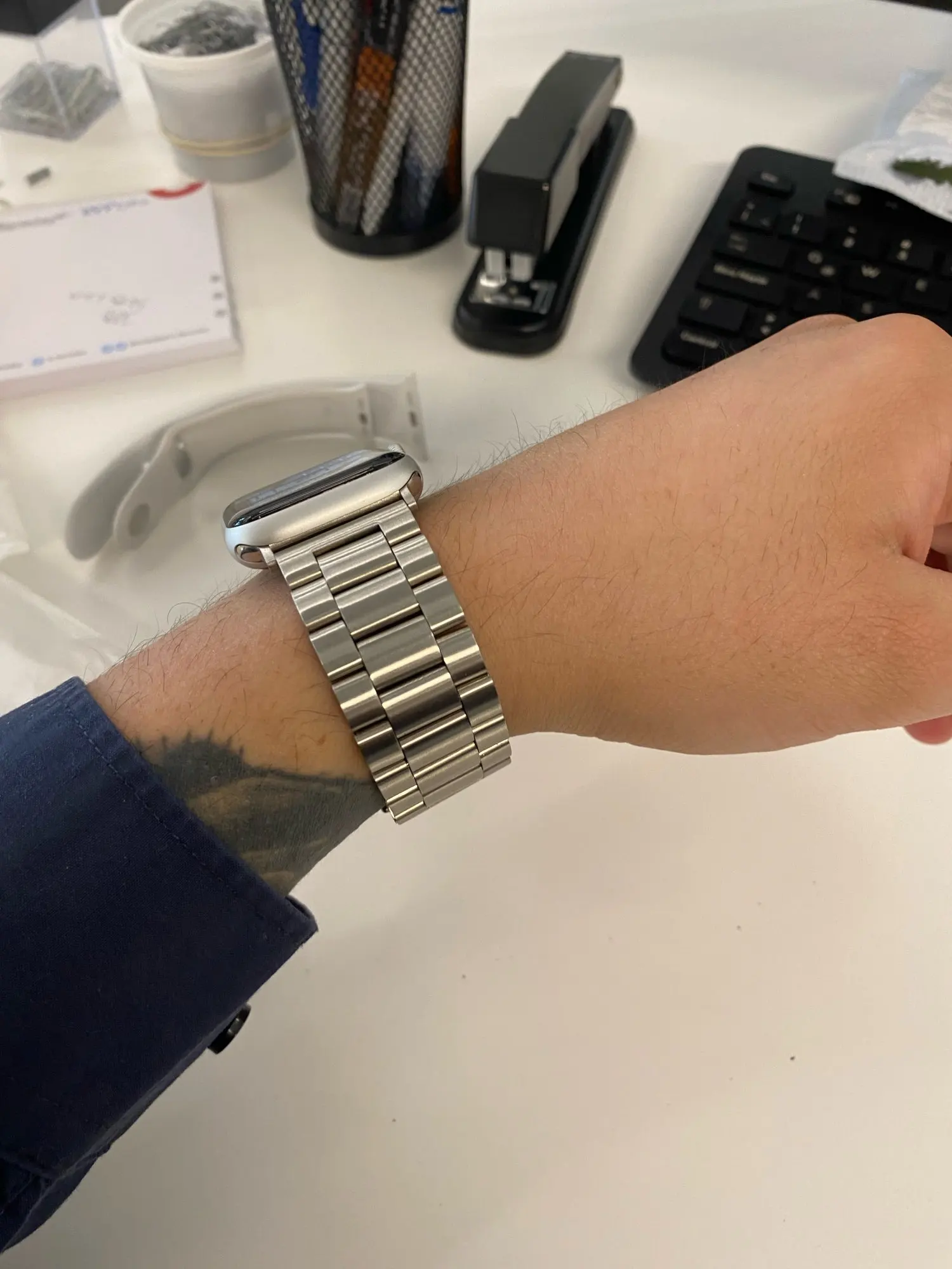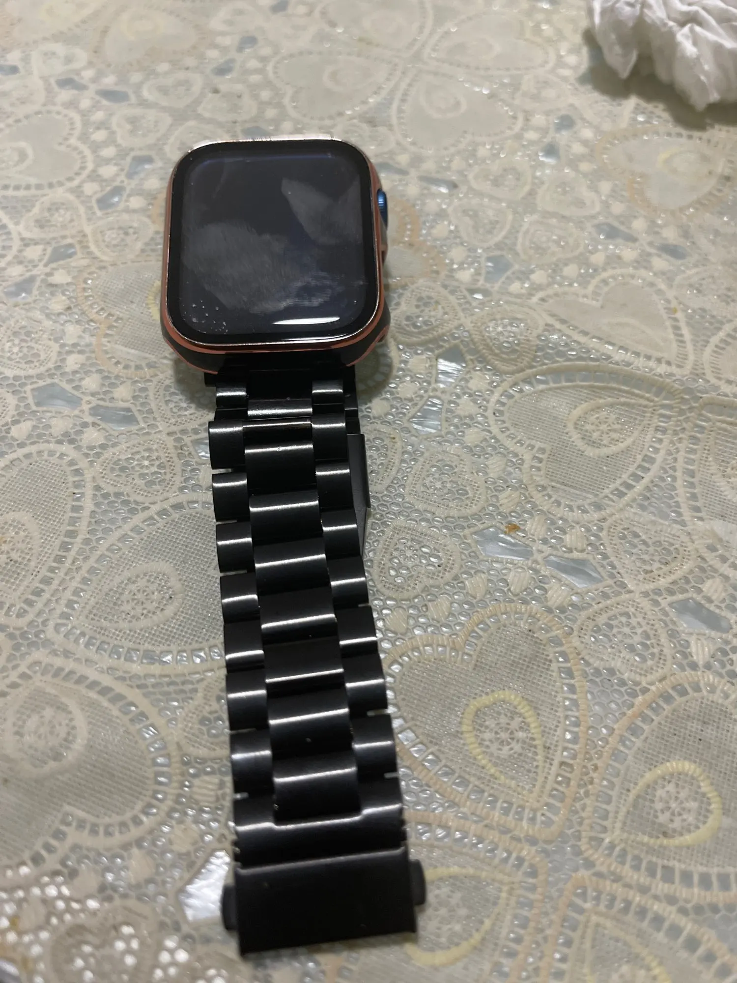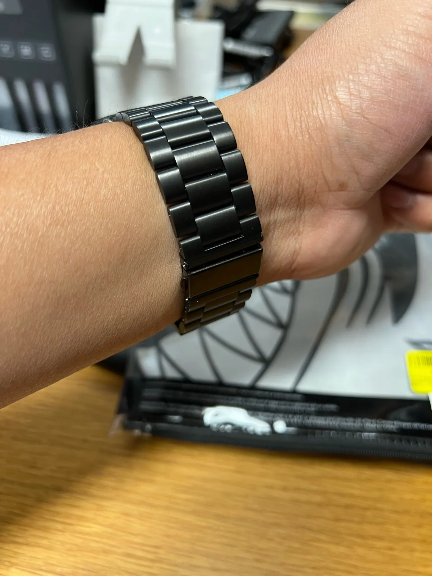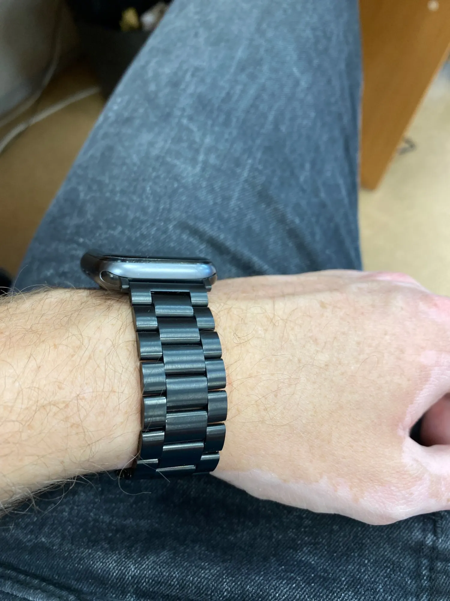 Довольно дешевый металлический ремешок, размер подогнал довольно точно, в целом хорошо, можно купить несколько. Думаю краска сотрется быстро с него.
