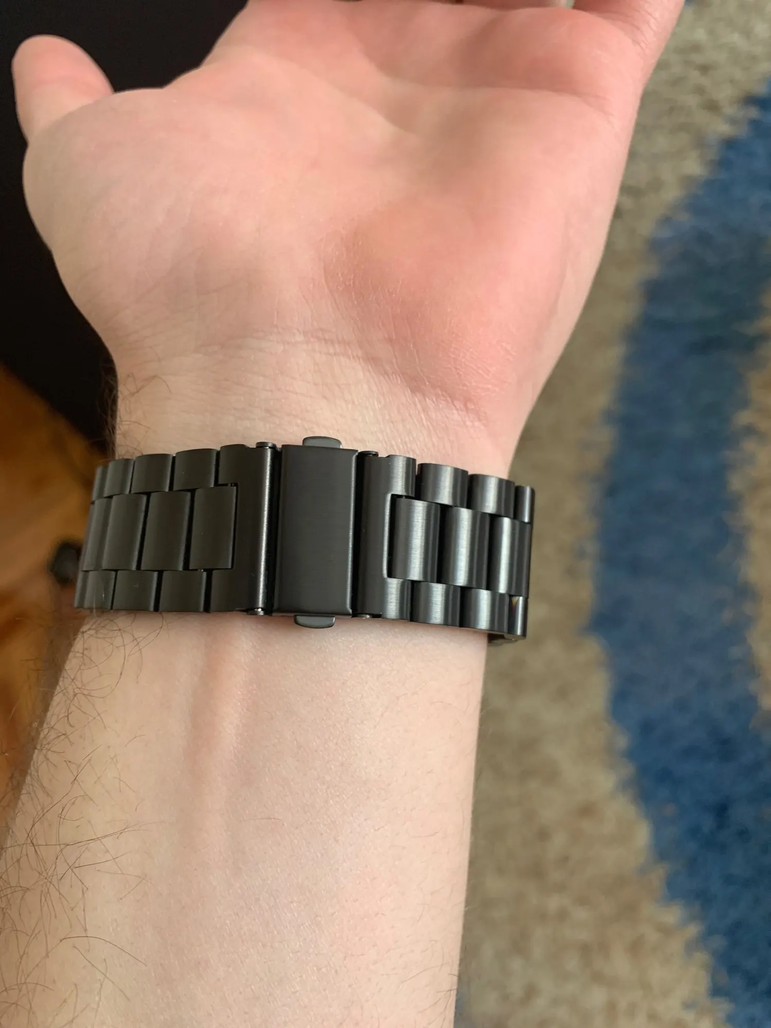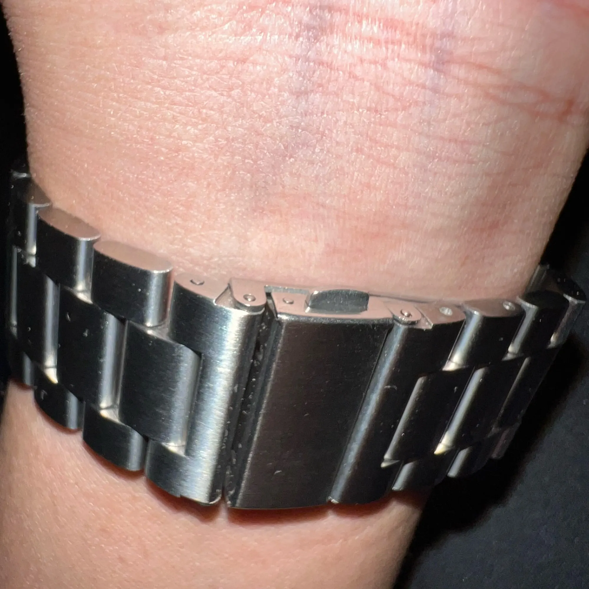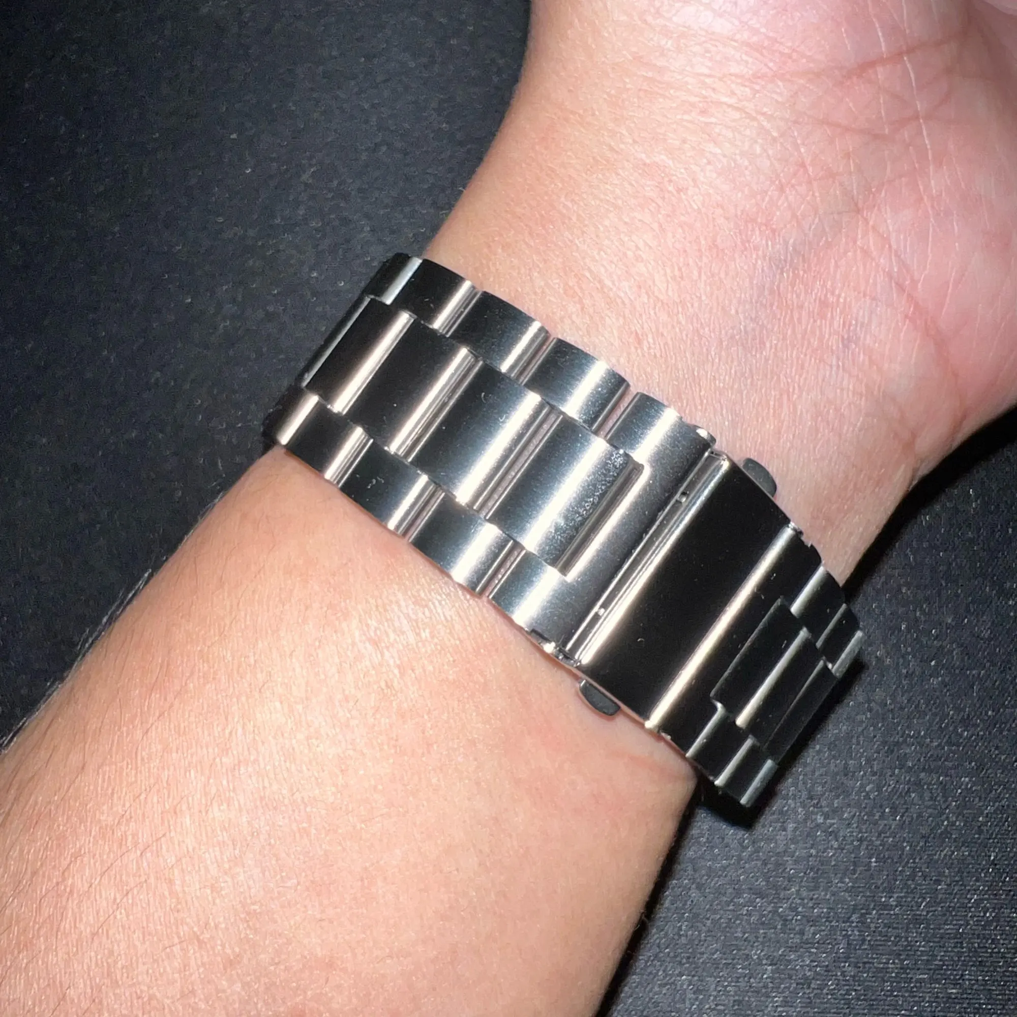 Неплохой ремешок на мужскую руку, увесистый, но на руку ложится комфортно. Оценка в 4 звёзды из за непрокраса между звеньями, на руке этого не заметно, но на изгибе отчетливо видно. Доставка в Красноярск за 9 дней.