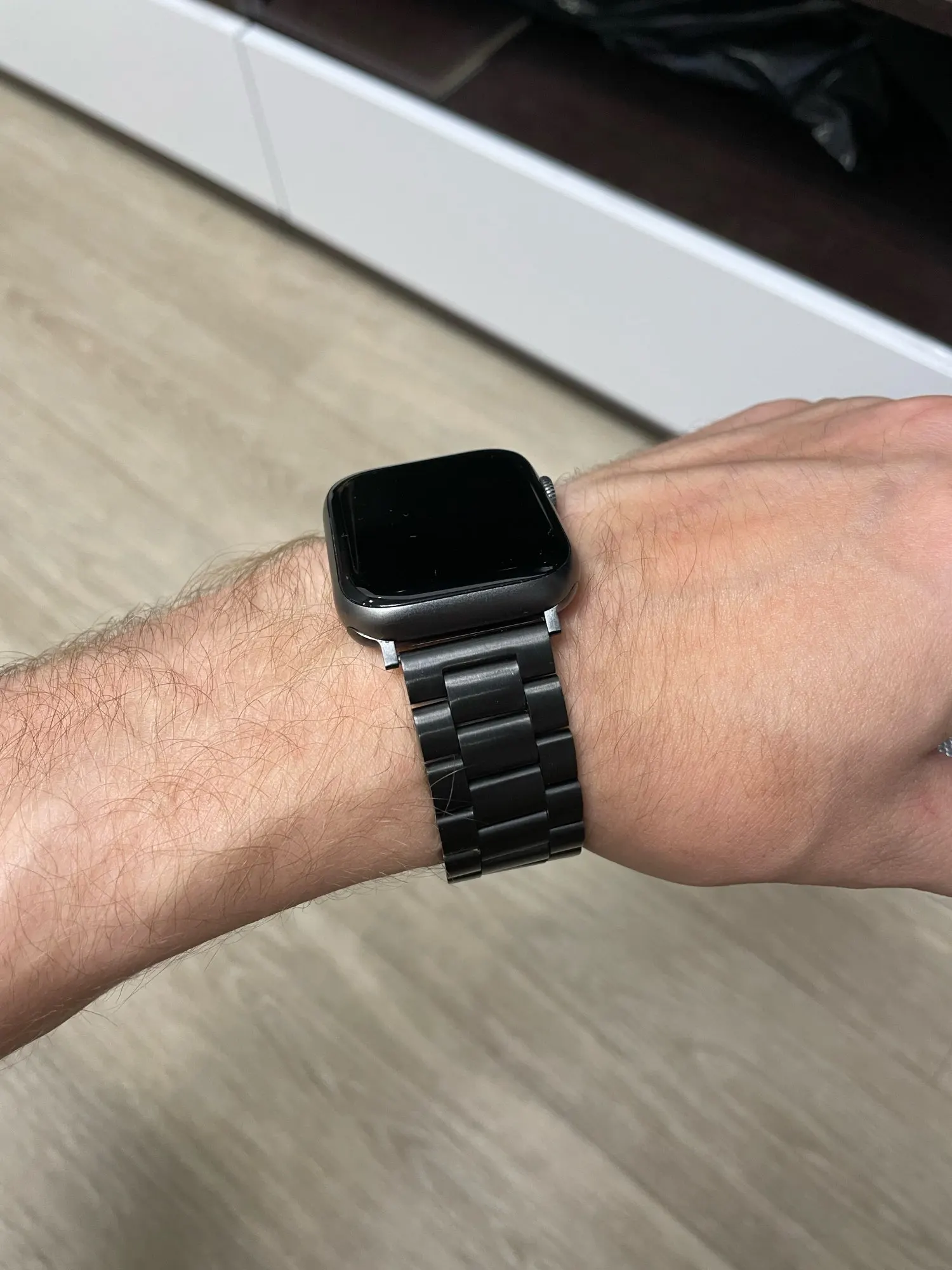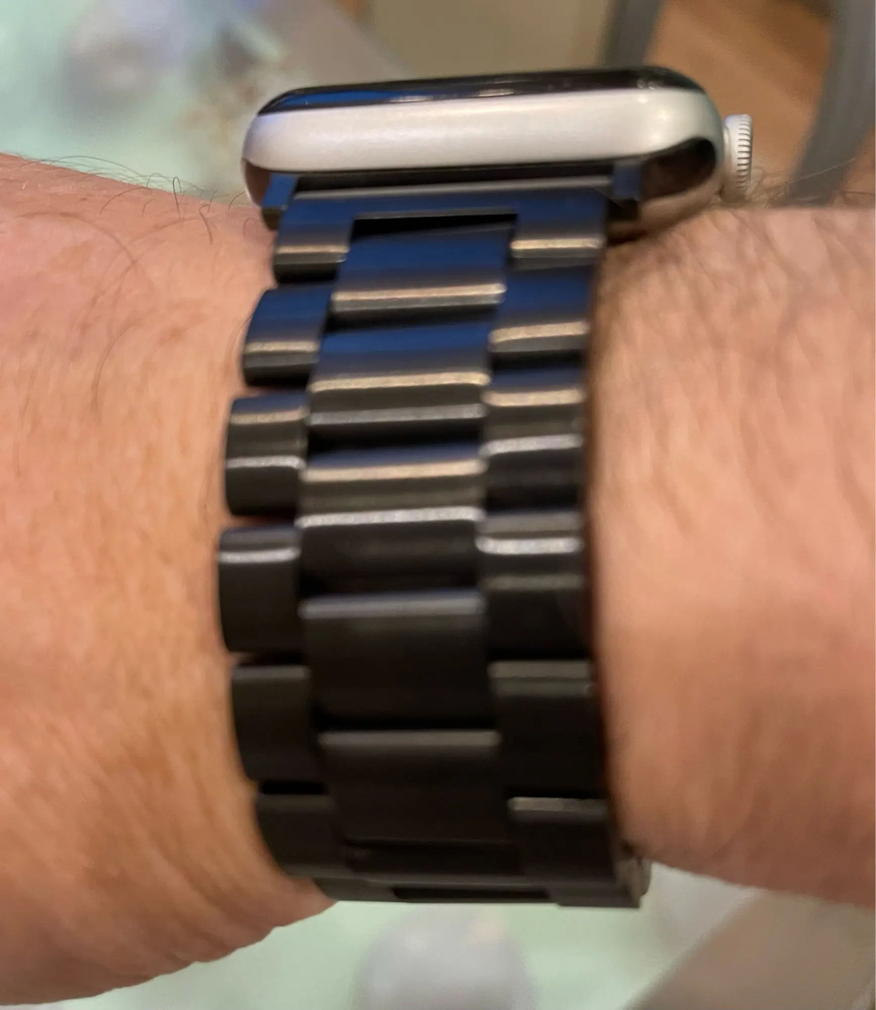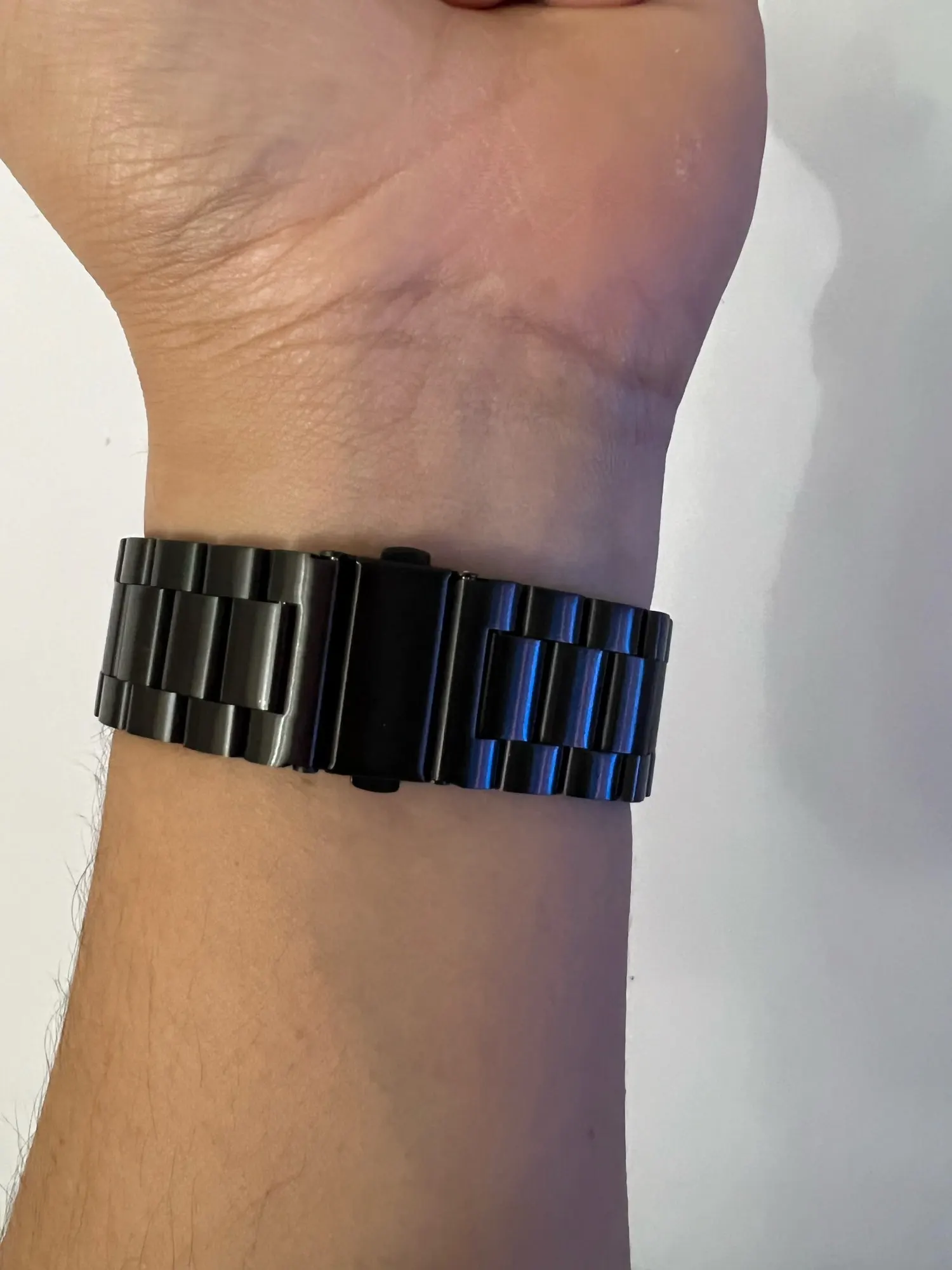 Пришёл ремешок очень быстро, даже не ожидал, шёл из Китая. По размеру он на огромную руку, из-за того что есть шпуля эта, уменьшил пол свою. Все круто. Думал будут цеплять волосы эти металлические пластинки, но оказалось что все ок. Не царапается. Качественно короче