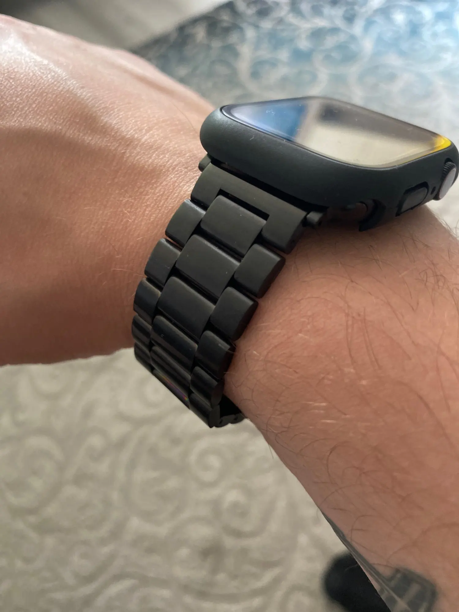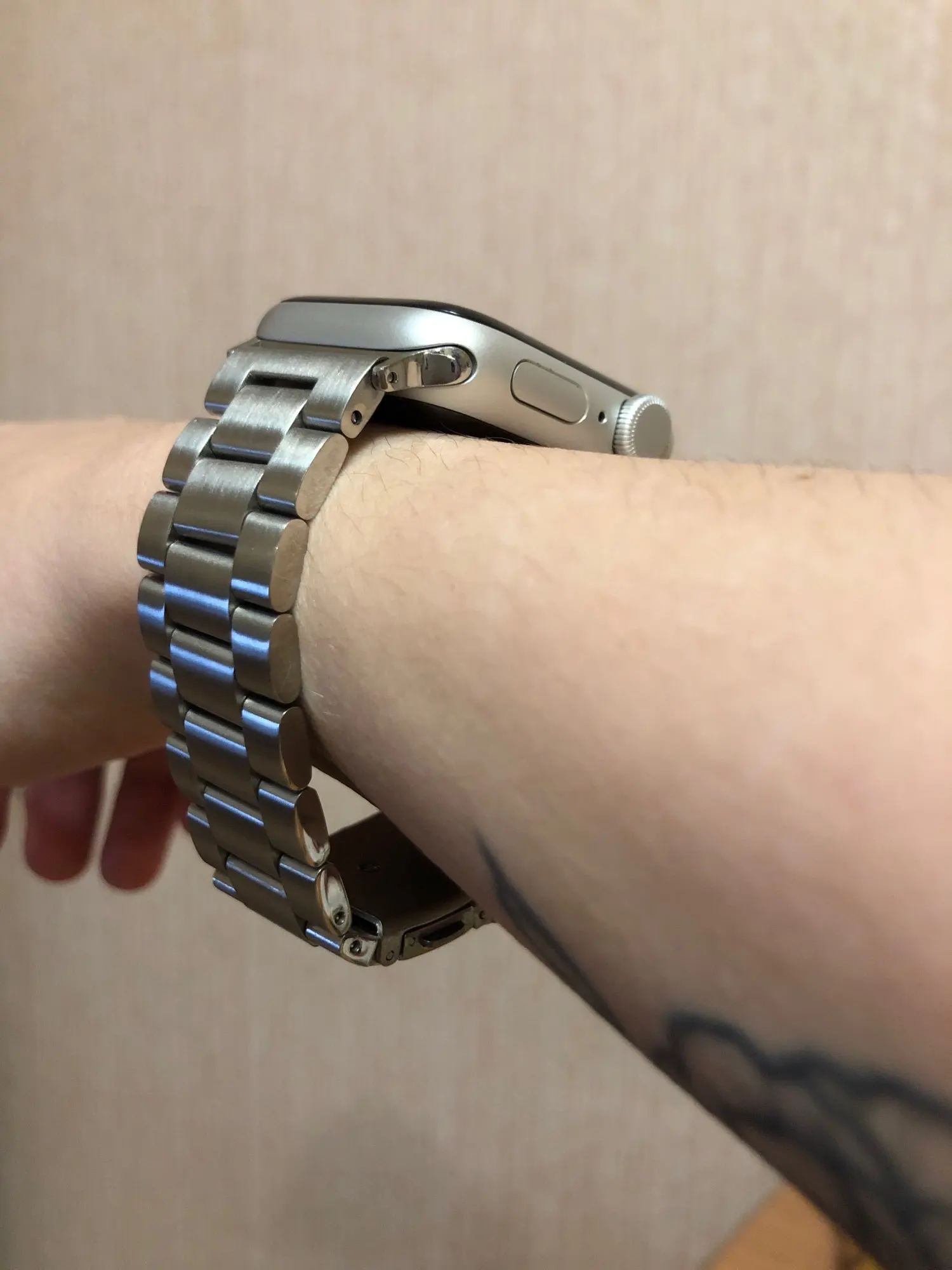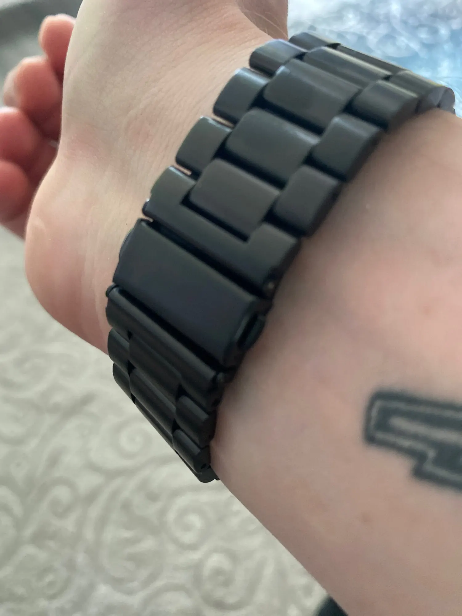 Пришёл ремешок очень быстро, даже не ожидал, шёл из Китая. По размеру он на огромную руку, из-за того что есть шпуля эта, уменьшил пол свою. Все круто. Думал будут цеплять волосы эти металлические пластинки, но оказалось что все ок. Не царапается. Качественно короче