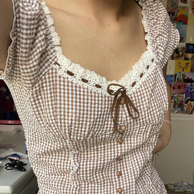 Y2k Kawaii Sweet короткий топ Fairycore Gunge Ретро клетчатая кружевная рубашка с оборками на подоле 90-х годов винтажный буф рукав молочный Топ для женщин