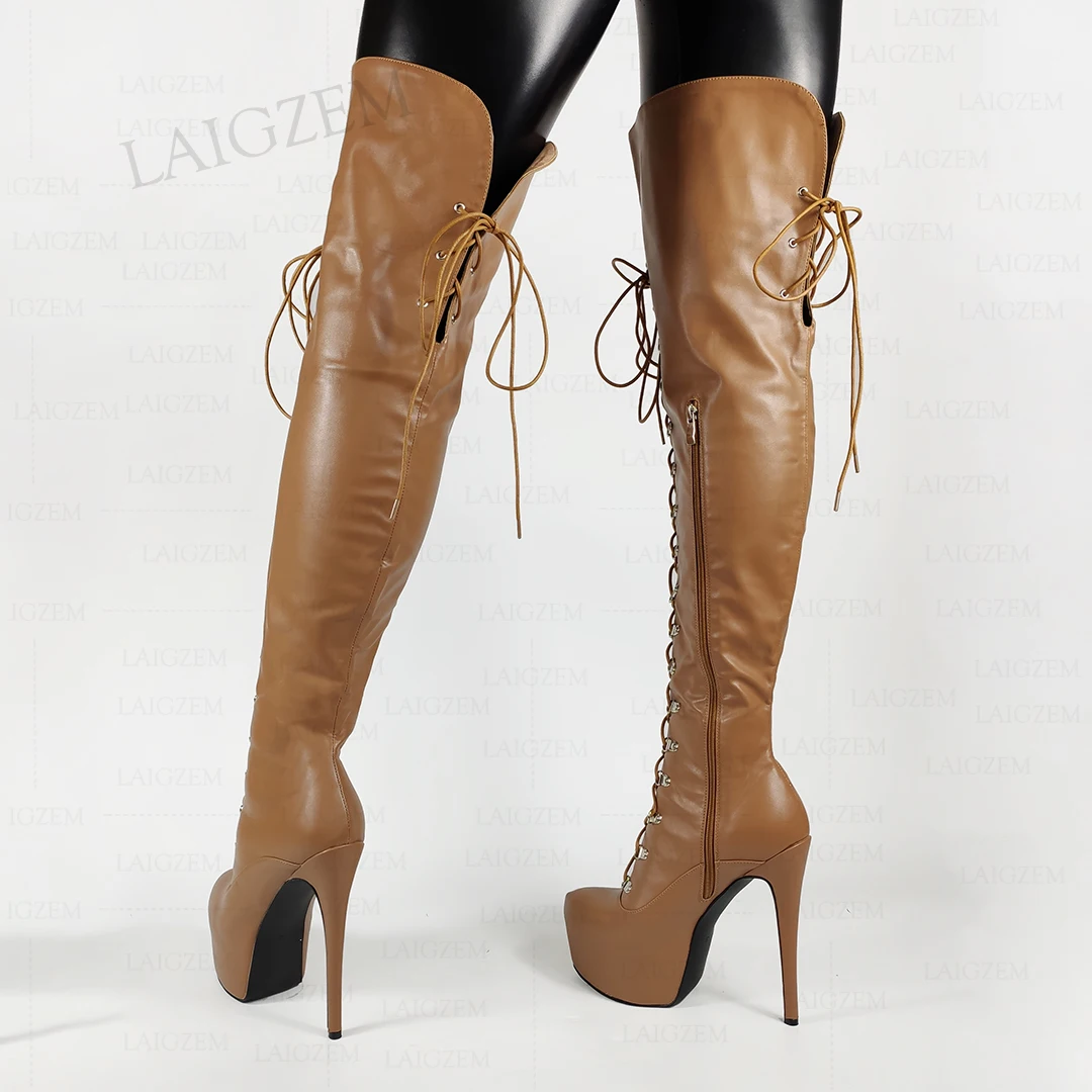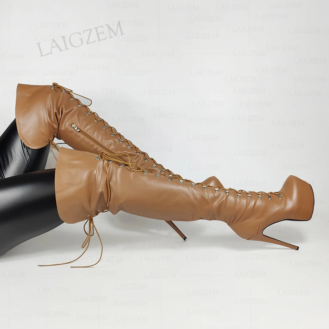 LAIGZEM/женские Сапоги выше колена на платформе высокие сапоги на высоком тонком каблуке с боковой молнией Дамская обувь из искусственной кожи женские большие размеры 42, 44, 46, 52