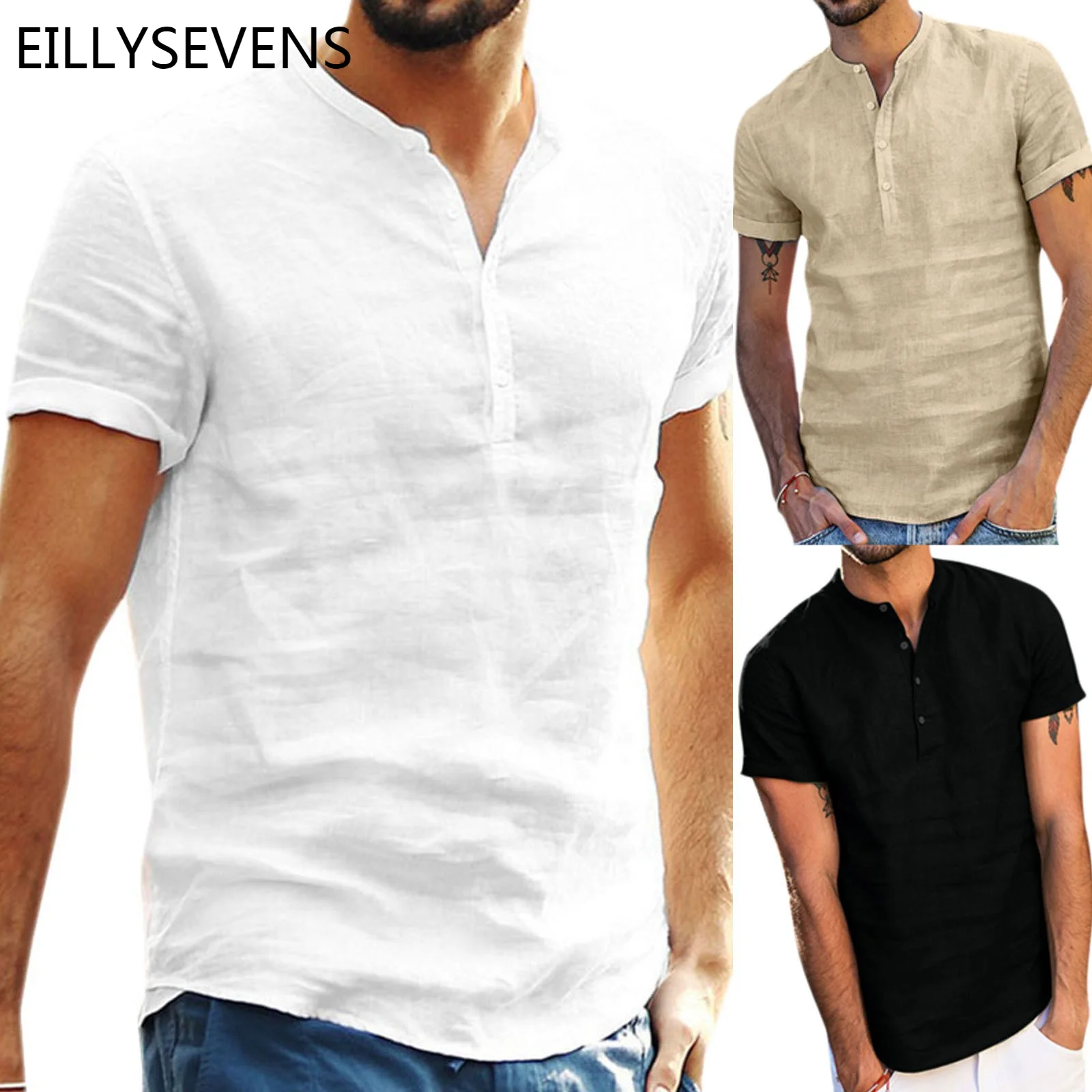 Мужская Летняя однотонная хлопковая льняная рубашка с короткими рукавами и воротником-стойкой на пуговицах